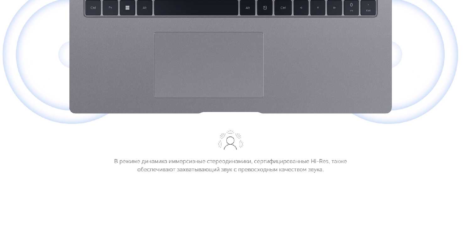 Динамики с верхним расположением (под клавиатурой) выдают чистые средние и высокие частоты, достаточные для просмотра лекций, подкастов и видео-конференций. Низкие частоты практически отсутствуют, максимальная громкость ограничена. Для музыки рекомендуется подключение внешних колонок или наушников. Утилита Nahimic улучшает звучание через эквалайзер-пресеты.