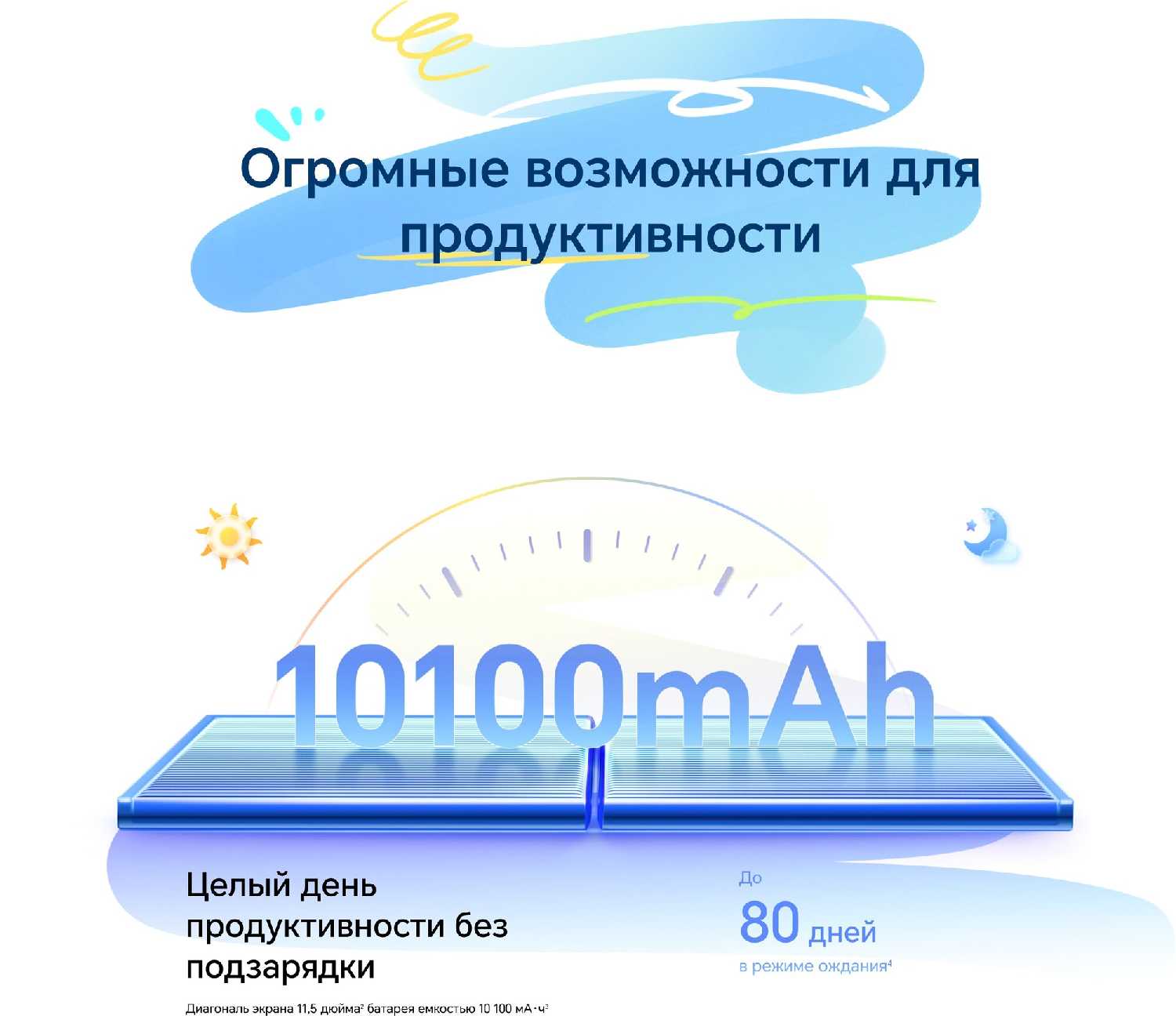 Батарея ёмкостью 10100 мАч обеспечивает 1.5–2 дня работы при умеренной нагрузке (веб-сёрфинг, документы). В игровом режиме расход составляет ~10% в час, а для видео или монтажа — 7–8%. Энергосберегающие режимы продлевают время работы на 20–30%. Реальной ёмкости хватает на рабочий день даже при интенсивном использовании, что подтверждается тестами пользователей. -