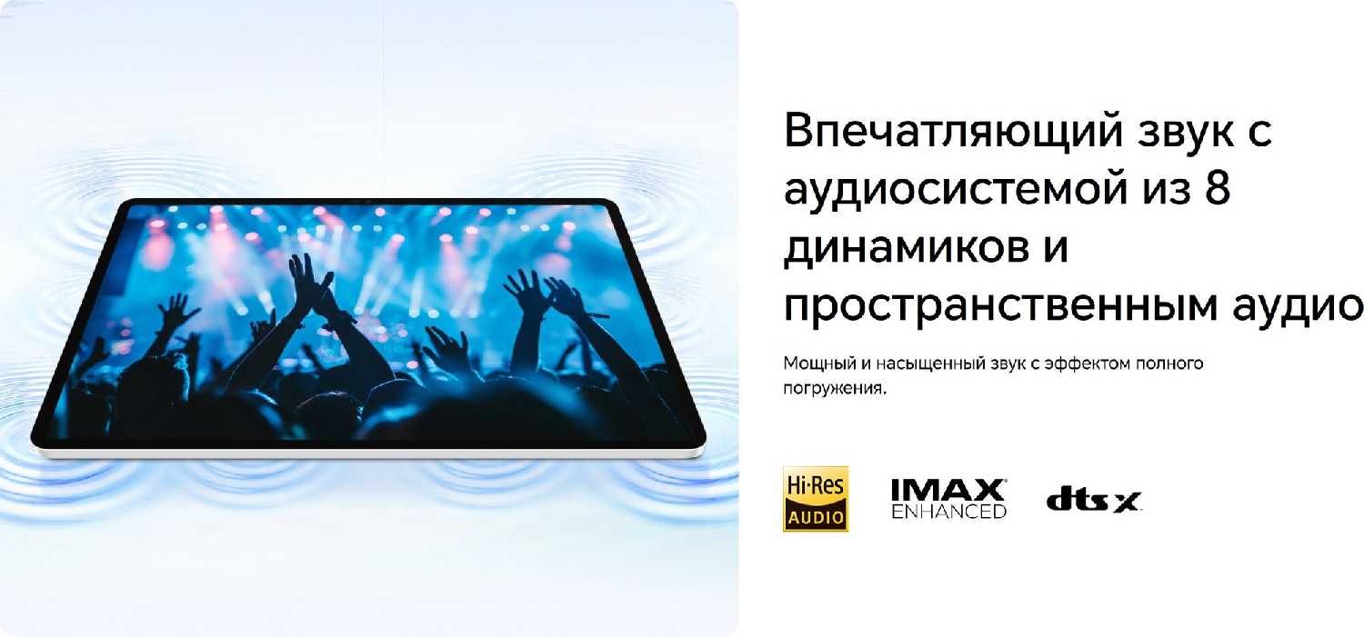 Восемь динамиков с поддержкой IMAX Enhanced и DTS:X создают объёмное звучание с детализацией средних частот, но басы слабо выражены. На максимальной громкости возможны хрипы, а общая мощность ниже, чем у Lenovo или Xiaomi Pad 6s Pro. Для фонового прослушивания и игр звук достаточен, но в шумных помещениях не хватает мощности. Подключение наушников (включая Samsung) стабильно, но иногда требует ручной настройки кодеков. -