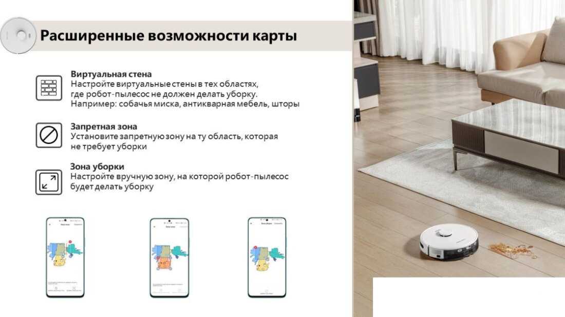 Нет ограничителя зон через приложение. Нет построения карт комнат. Просто показывает карту путешествий пылесоса за прошедшие уборки и все . Не все телефоны находят пылесос . В общем нет половины фишек из за которых купили его