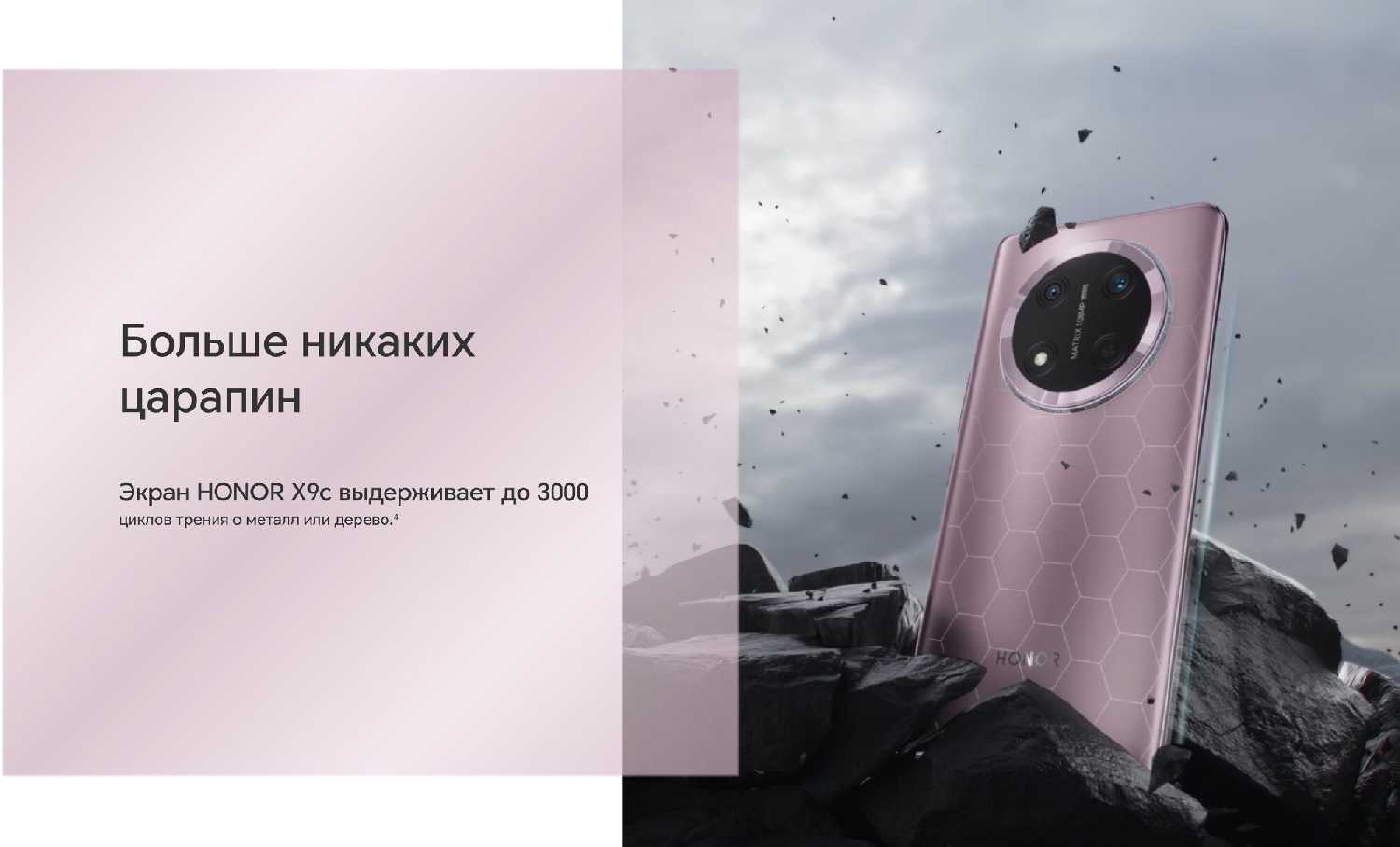 Прочность и эргономика:Корпус Honor X9c — один из самых защищенных в сегменте. Пластиковая задняя панель с матовым покрытием устойчива к царапинам, а рамка поглощает удары при падениях на бетон или асфальт. Пользователи-байкеры и строители подтверждают: даже после падений с метровой высоты на плитку трещин не возникает (в заводском чехле). Однако скругленные края экрана «водопад» повышают риск повреждений при боковых ударах — рекомендуется использовать противоударные чехлы. Вес в 196 г и толщина 8.3 мм делают устройство удобным для одной руки, но из-за большого экрана (6.78") хват неустойчив. Отдельный плюс — предустановленная защитная пленка и силиконовый чехол в комплекте, хотя последний со временем желтеет и скользит в ладони.