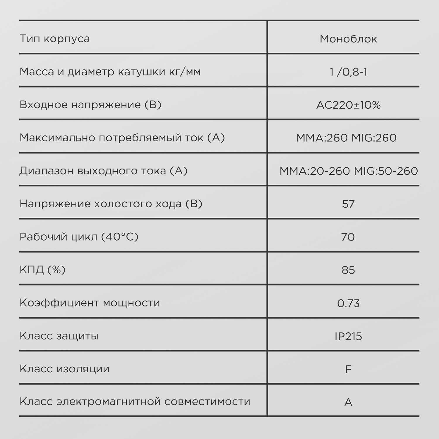 - сварочный ток MMA: 20 - 260 A