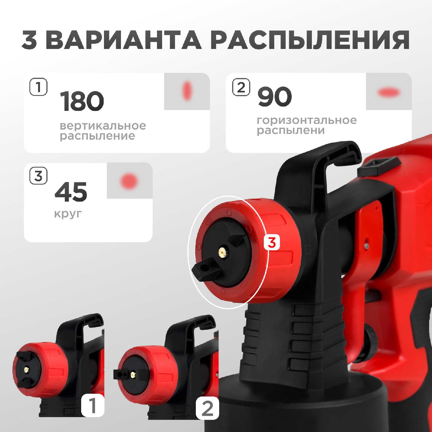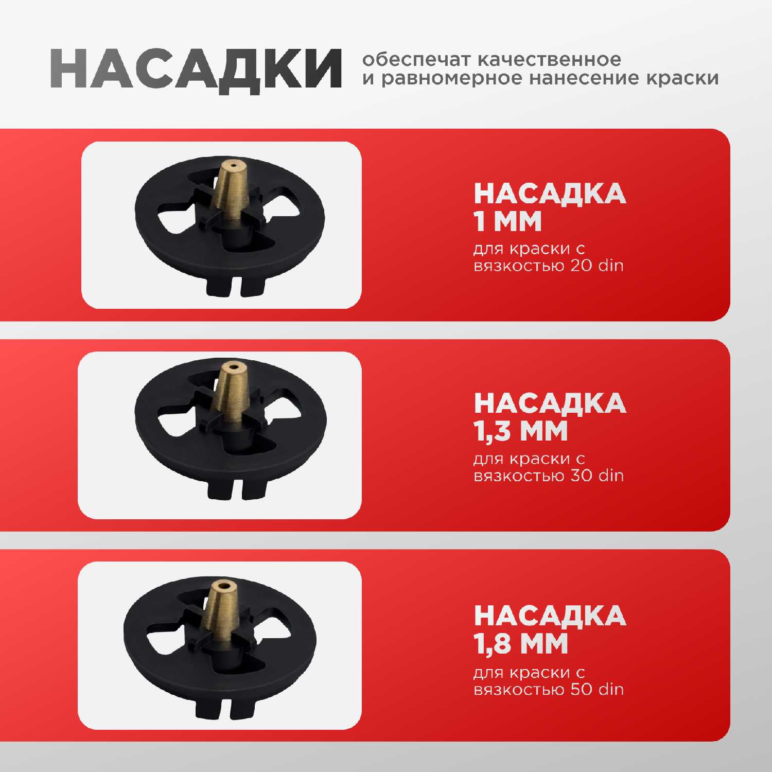 Заявлено три насадки разного диаметра для регулировки факела, но фактически часто поставляются одна или две. Насадки позволяют адаптировать распыл под различные материалы: тонкие — для лаков, широкие — для фасадных красок. Их отсутствие ограничивает функциональность, хотя для базовых задач хватает стандартной дюзы. -
