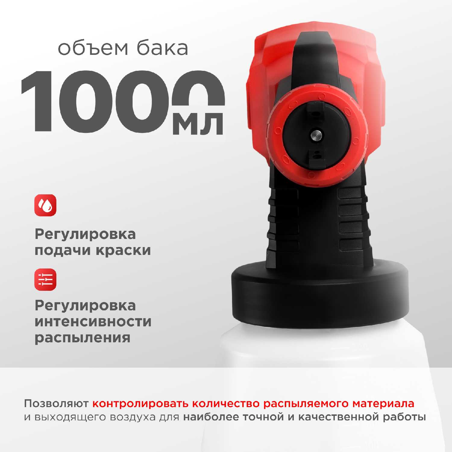 Фактическая ёмкость составляет 800 мл, несмотря на маркировку 1 л на коробке у некоторых партий. Этого хватает для непрерывной работы 15-20 минут. Пользователи отмечают удобство формы бачка, но критикуют непрозрачность материала, затрудняющую контроль остатка краски. -