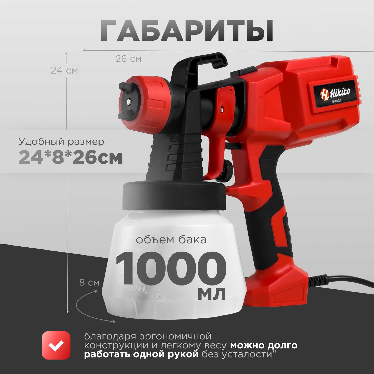 Эргономика и комфорт: Аппарат обладает сбалансированным весом и эргономичной рукояткой, позволяя удерживать его одной рукой даже при вертикальном распылении. Это упрощает покраску труднодоступных участков, например, углов дома или решёток мангала. Кнопка постоянной работы снижает утомляемость кисти, однако короткий шнур (около 1.5 м) ограничивает мобильность, требуя удлинителя.
