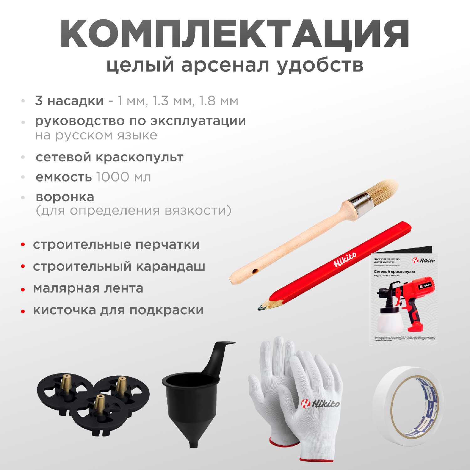 - + Внешне отличный краскопульт, 4 дюзы в комплекте, фильтры, перчатки, 3 салфетки, очки