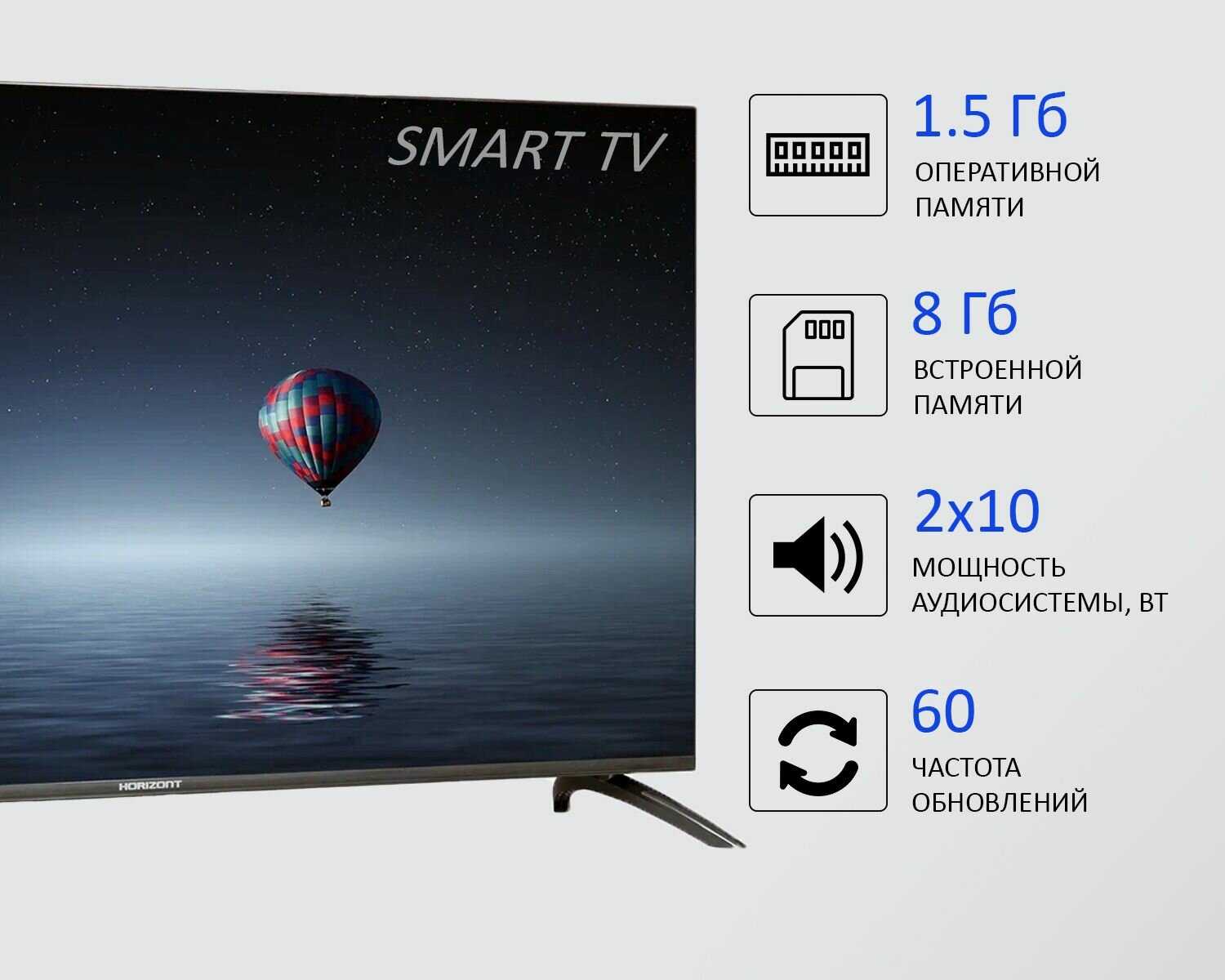 Сам телевизор огромный, то что и хотел, я изначально не хотел покупать известные марки и решил остановится на этом , хотя Горизонт , тоже себя зарекомендовал с хорошей стороны!