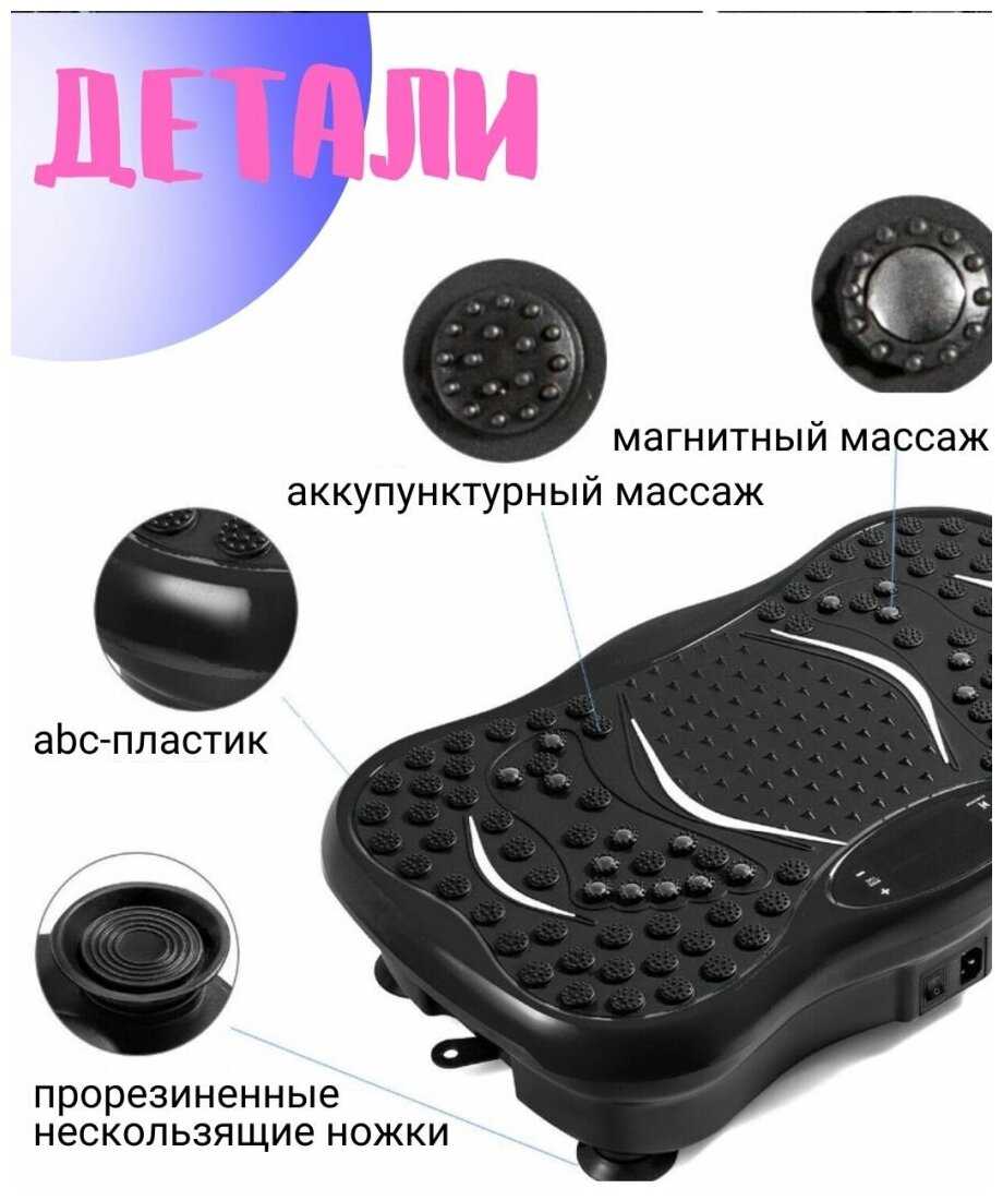 - + Хорошая виброплатформа. Интуитивно все понятно, много режимов, как минимум, отеки сгоняет хорошо, покупалась именно с этой целью