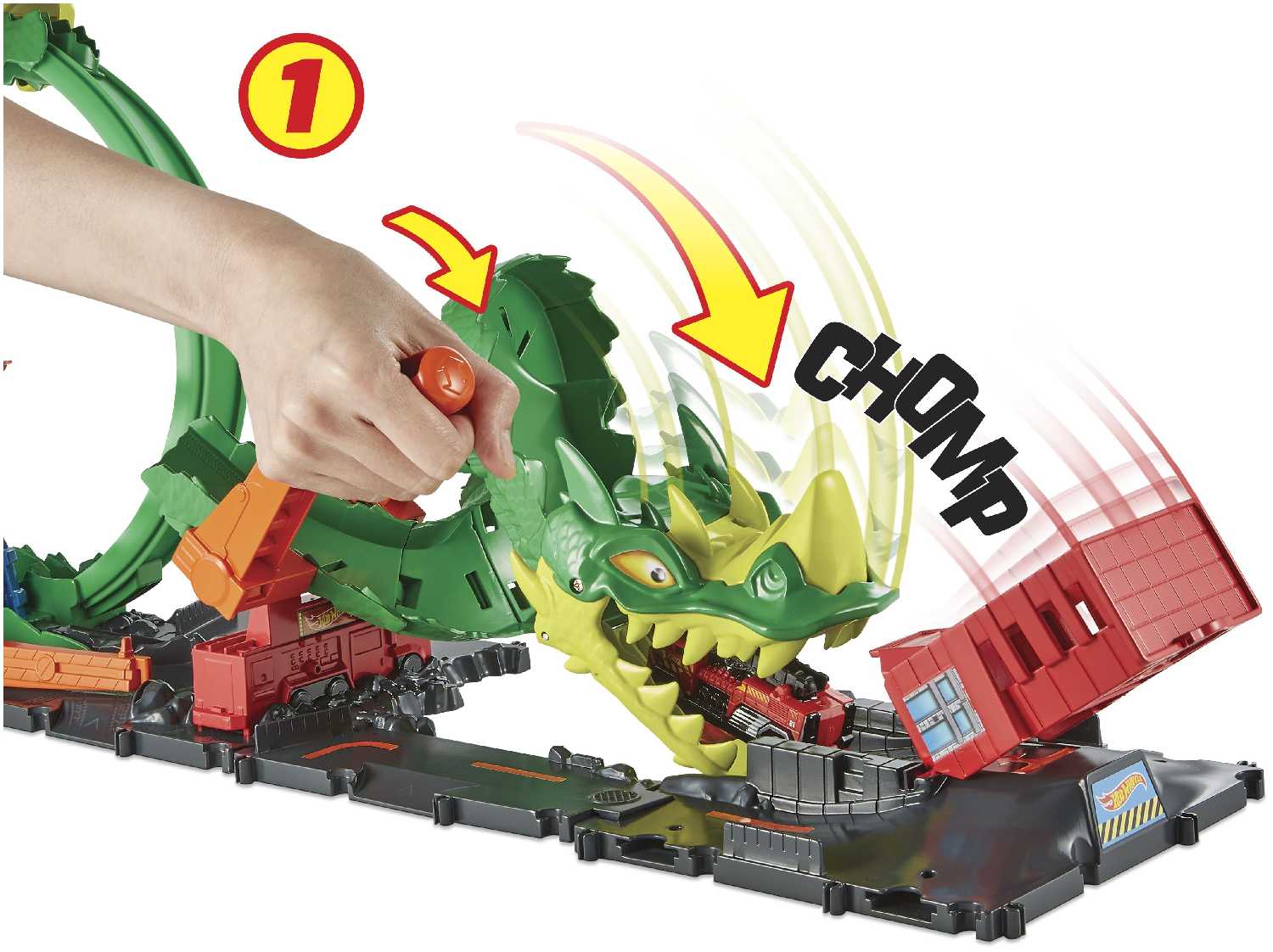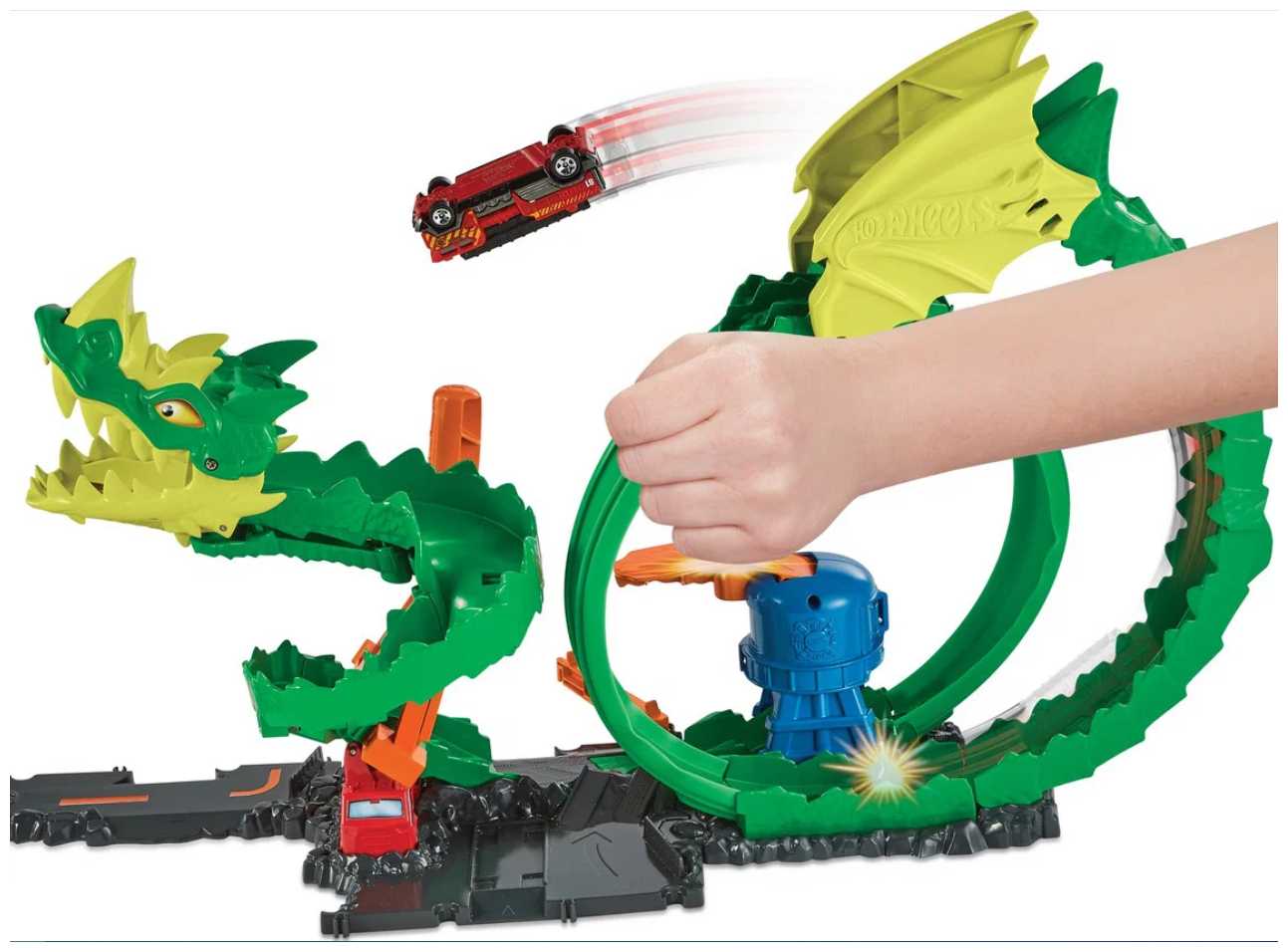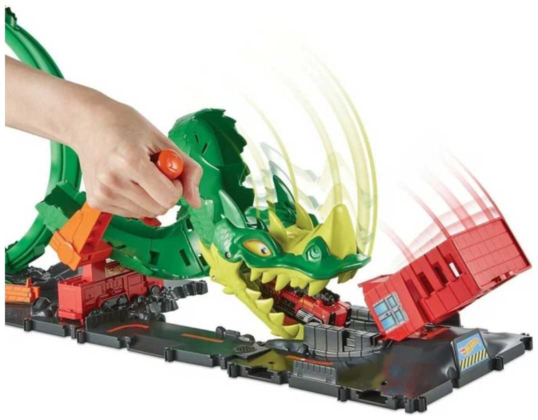 Фигура дракона служит центральным элементом трека с крутыми виражами внутри "туловища". Его спиралевидные секции создают эффект "круговорота" — машинки многократно вращаются перед выездом. Яркая окраска и крупные детали (голова, крылья) визуально привлекают детей. -