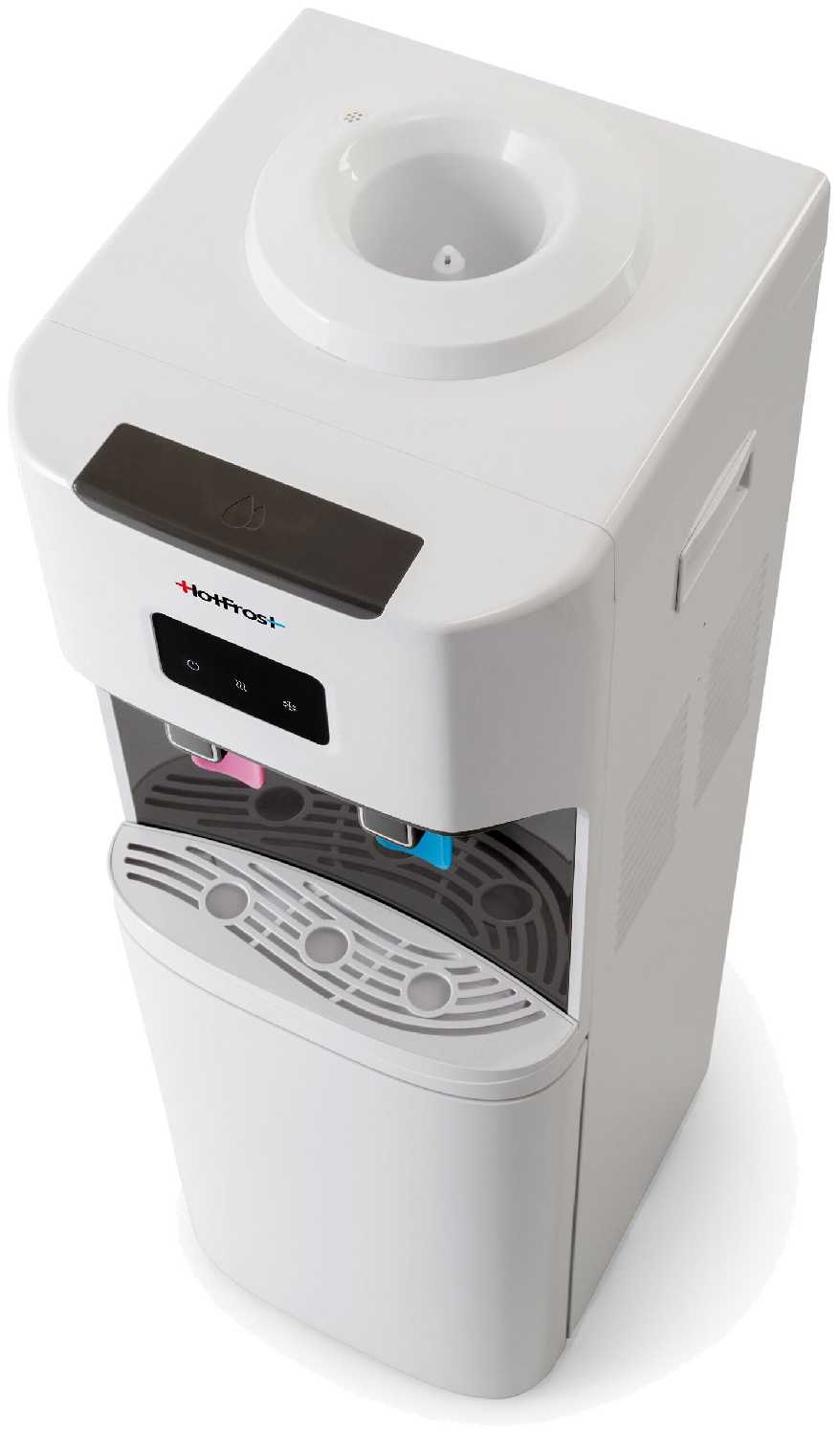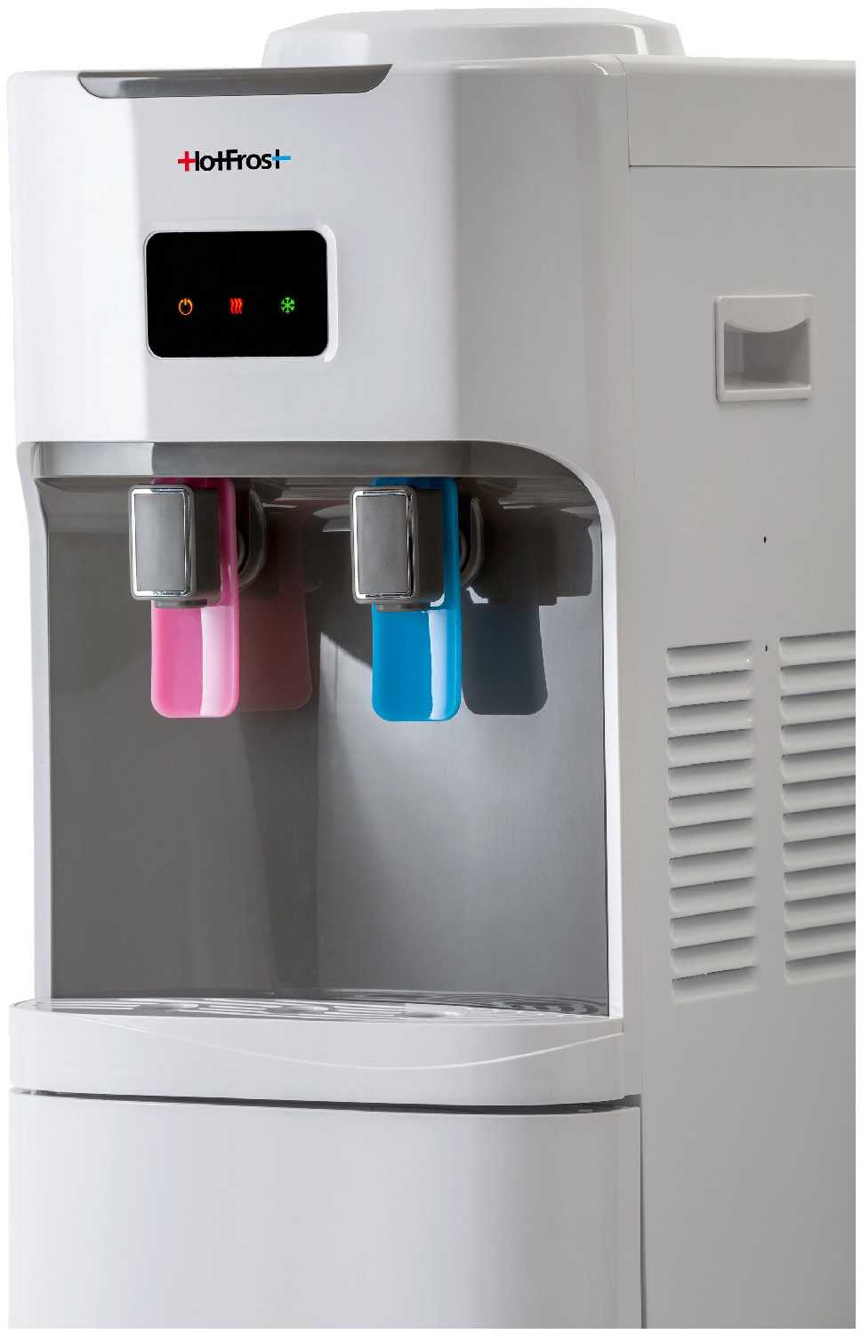 Не шумный, очень симпатичный, панелька в области кранов не черная, а цвета графит, смотрится аккуратно и стильно. Имеется вместительный шкафчик. По бокам - выемки для рук, при переносе кулера очень удобно. Кулер не тяжелый. Удобно, что кнопки выключения нагрева и охлаждения с боку, а не сзади. Хорошо охлаждает и нагревает воду. Холодная такая как, будто бы в воду комнатной температуры, добавили лед, но мы не включаем охлаждение, чтобы ребенок набирал воду комнатной температуры. Мы перестали кипятить воду в чайнике для чая, набираем из кулера, при этом достаточно горячая даже приходится разбавлять холодной. Вообще как мы без него жили!) очень удобно и функционально, мы очень рады покупкой. Перед выбором просмотрела не один сайт и не один день, рада что остановилась на этом варианте, не смотря на цену.