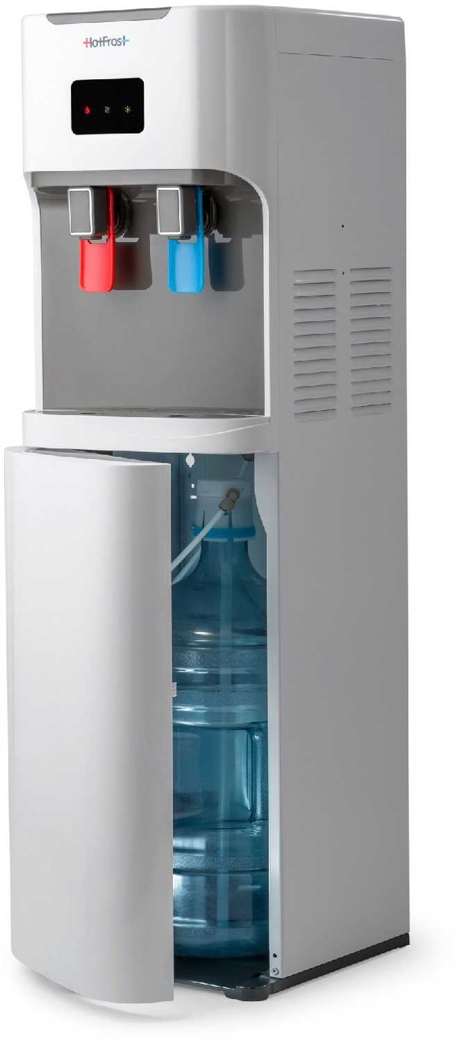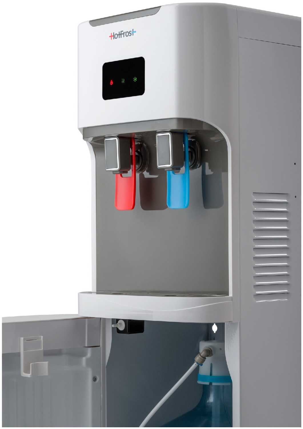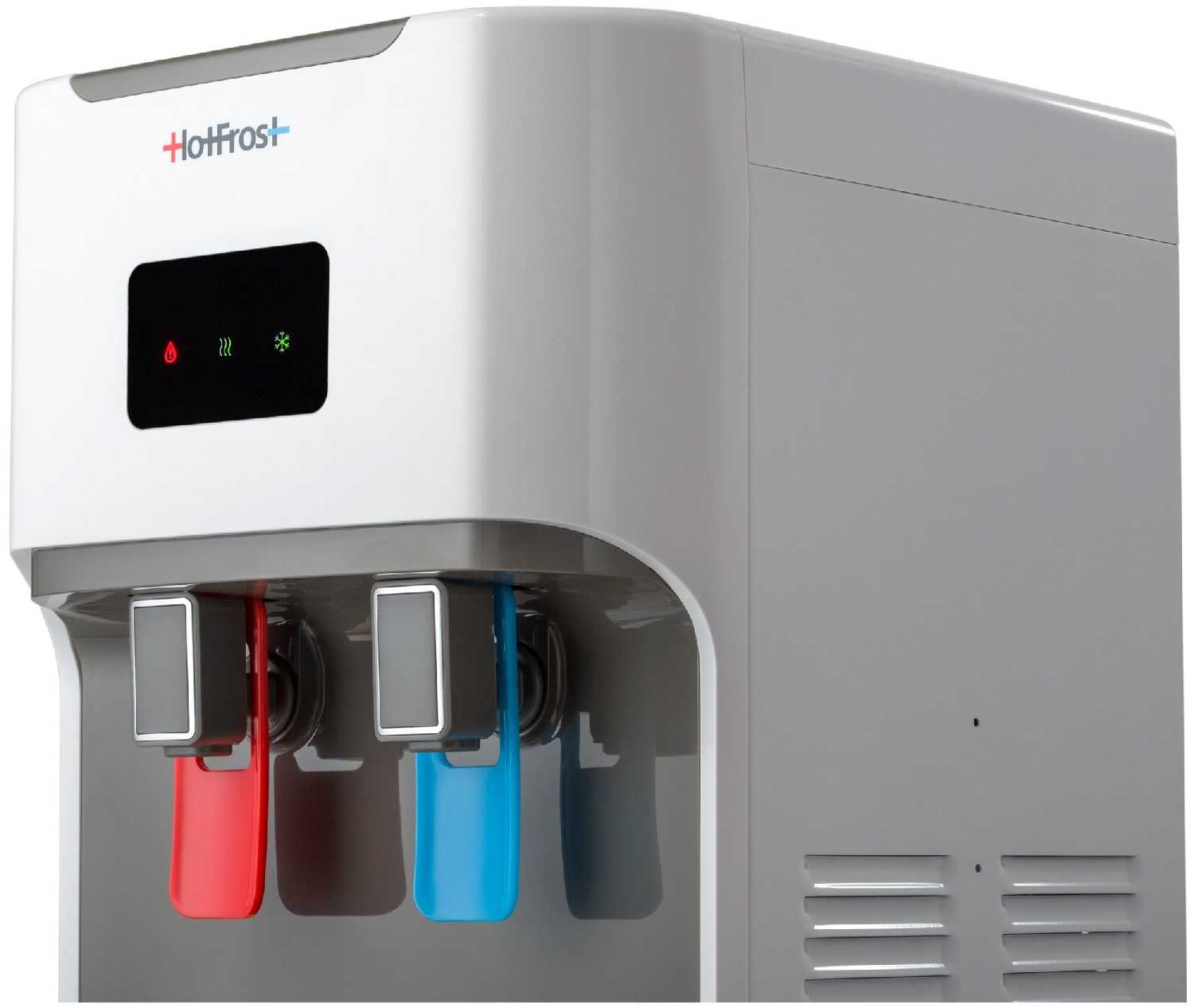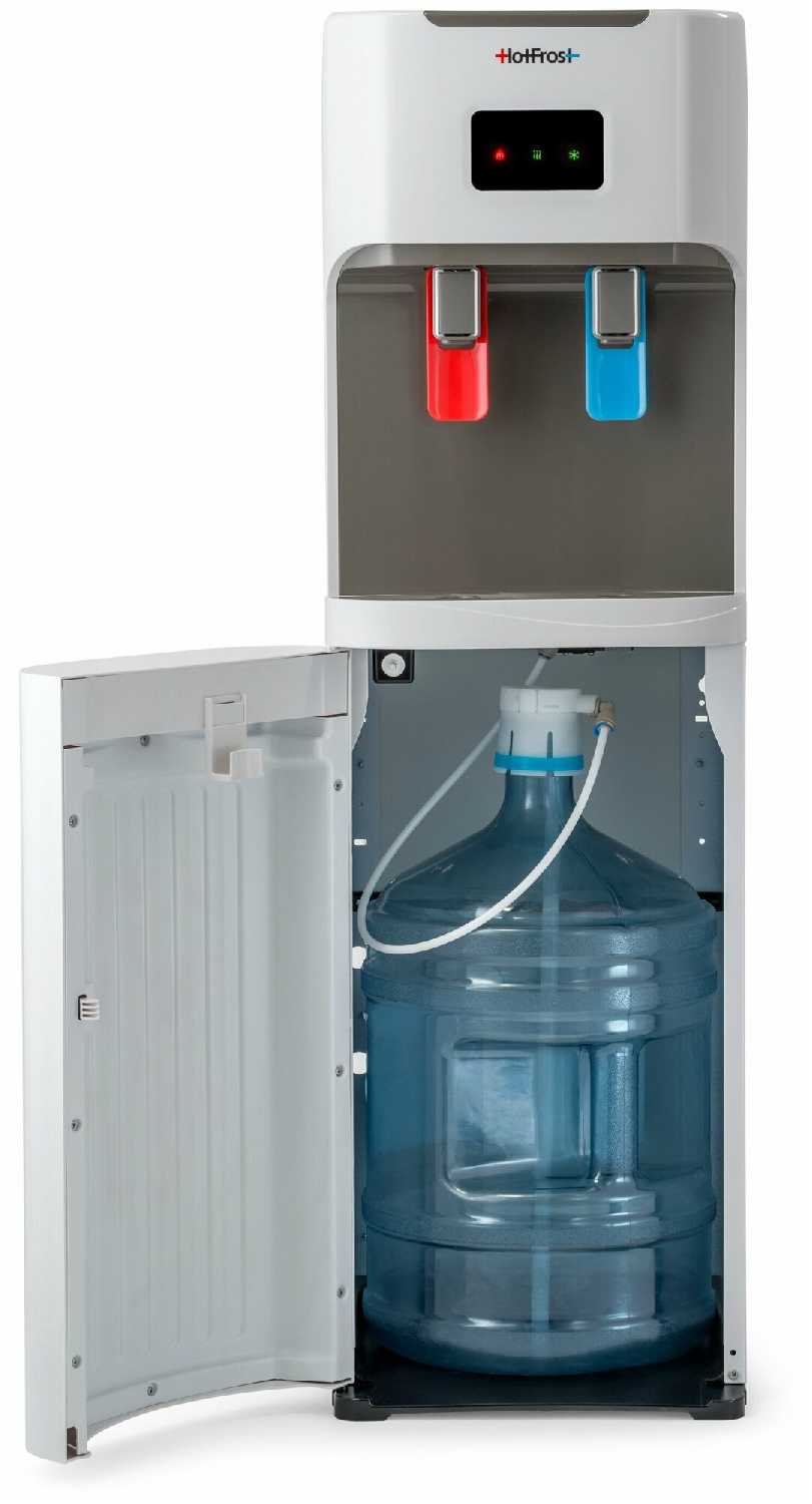 - + Компактный, бутыль удобно размещается внизу, что упрощает установку. Лаконичный вариант для квартиры (нет ощущения, что ты в офисе). Воду греет и охлаждает быстро