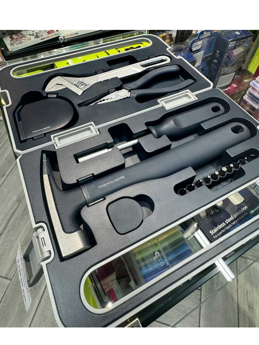 - + Качественный, взял за очень недорого для такого набора, инструмент приятно лежит в руке, рукотки с антискользящим покрытием, рулетка плавно затягивает ленту, набор бит для отвертки топчик - даже 3х-гранная имеется, на молотке ниодим для гвоздей, кейс сам по себе стильный и смотрится четко, основные инструменты на защелках в кейсе