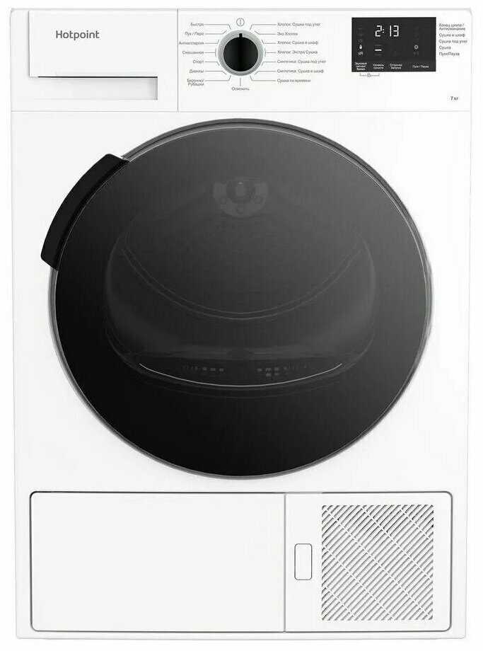 Время сушки регулирует сама, т.к. встроен датчик влажности. Компактная, стильная. Не шумная. Двойной фильтр внутри машинки для сбора пыли и ворса. Много режимов. Домашние футболки, трусы, носки сушила на режиме Бережная сушка и вещи не сели, даже носки не сели. И всё сухое. Спасибо Яндекс Маркету и магазину Hotpoint. Надеюсь, что мой отзыв поможет кому-то определиться с выбором.