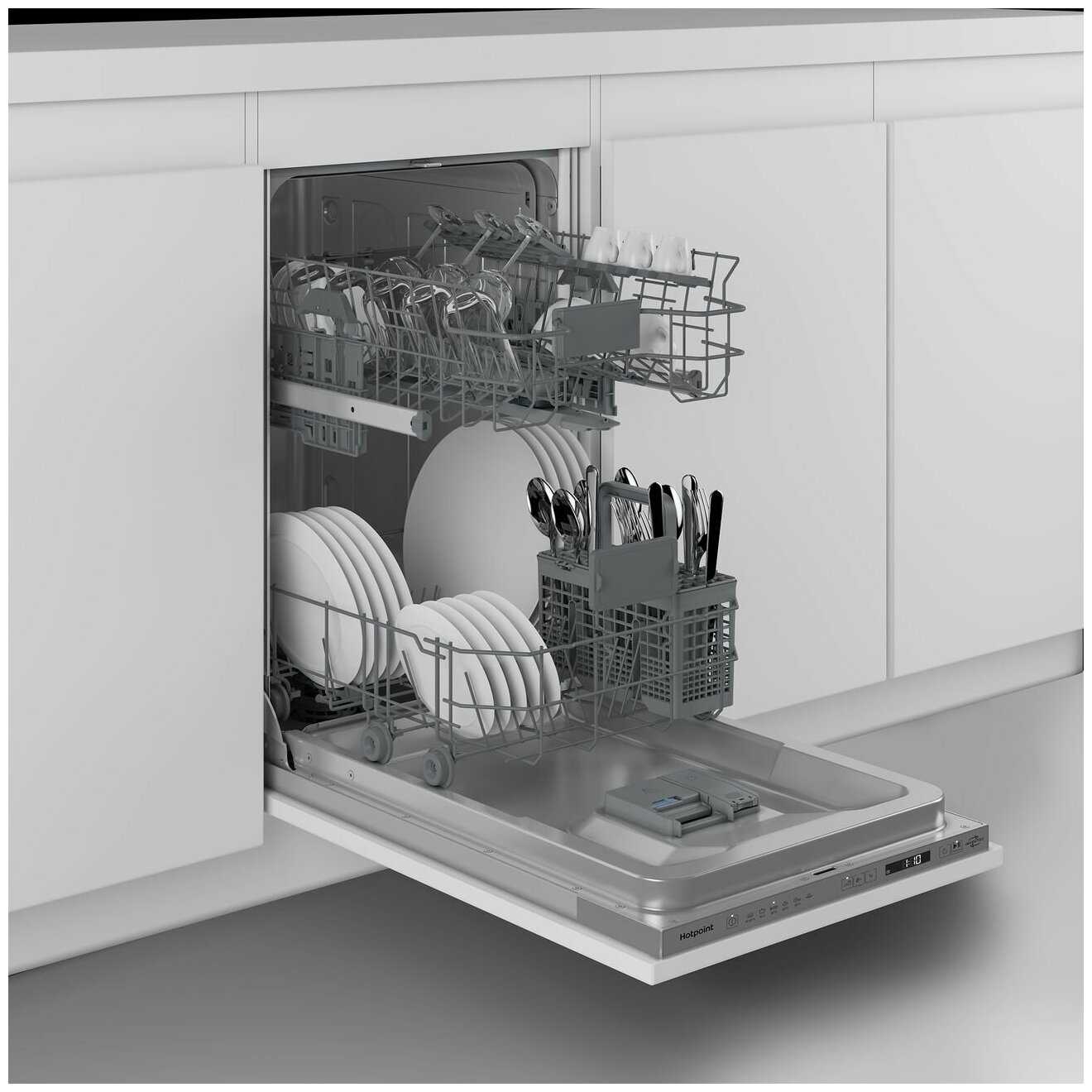 - Регулируемые держатели тарелок с шагом 2-3 см позволяют разместить до 10 глубоких комплектов.