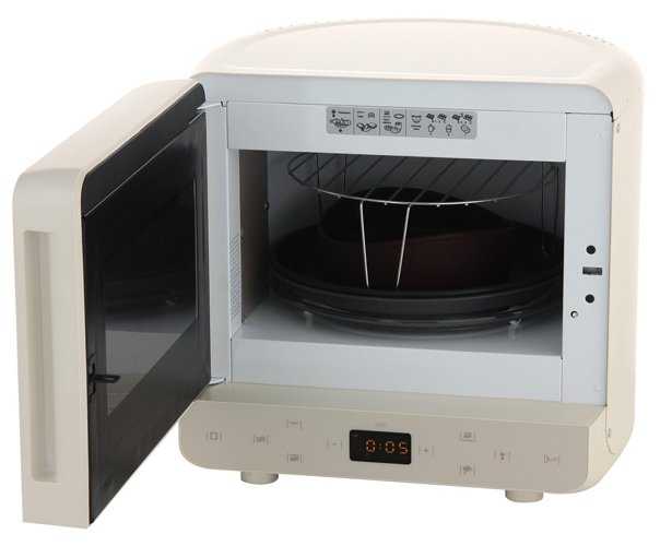 внутренние размеры камеры - высота 17 см глубина 29 см ширина 29 см возможность останавливать поворотный стол быстрый запуск в комплекте силиконовая чаша для приготовления в режиме "Шоколад", решетка для гриля в комплекте