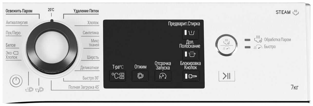 Интуитивное, с большим дисплеем, показывает время до конца, текущий этап, температуру, обороты. Блокировка кнопок от детей работает надёжно. Можно корректировать температуру, отжим, добавлять полоскание, но на некоторых режимах опции ограничены.