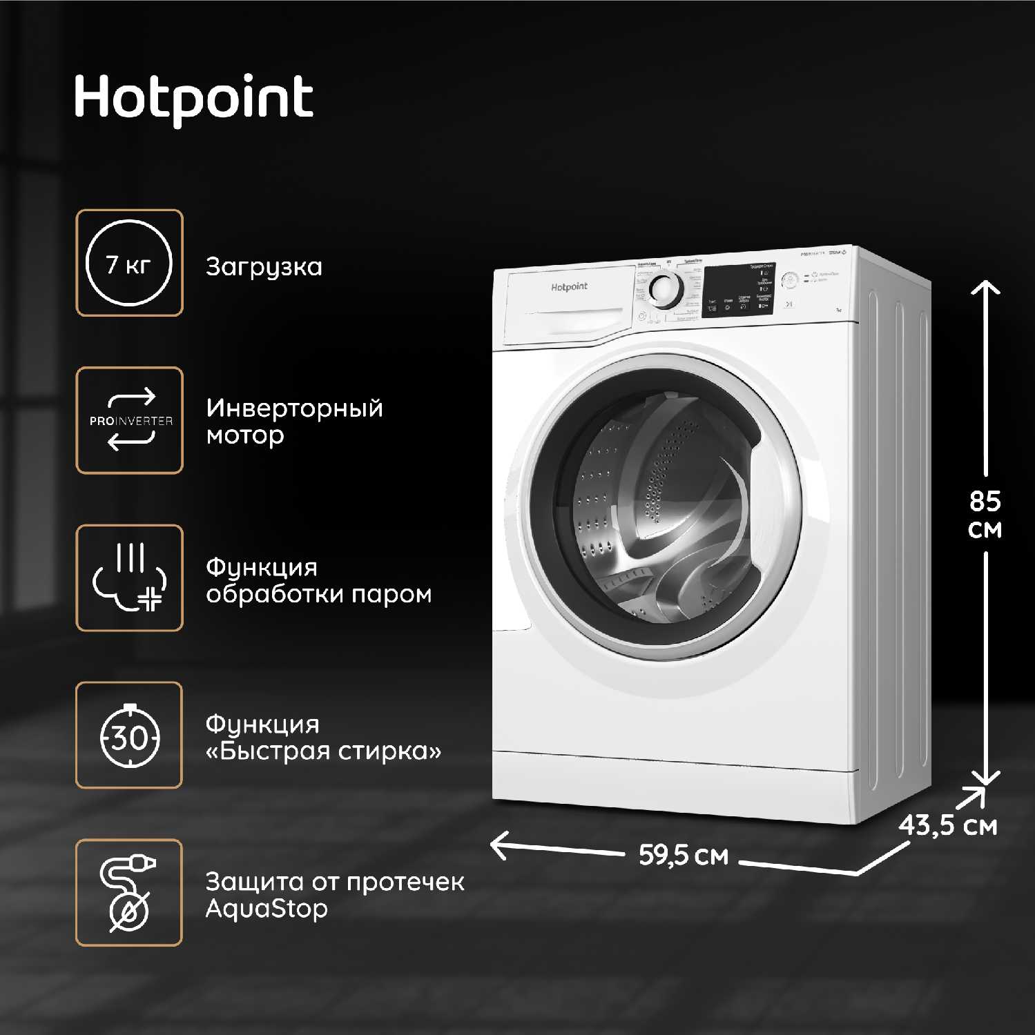 - Оптимальное соотношение объема барабана и габаритов корпуса делает модель подходящей для установки в ограниченном пространстве.