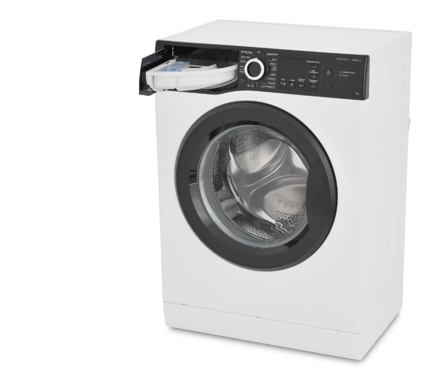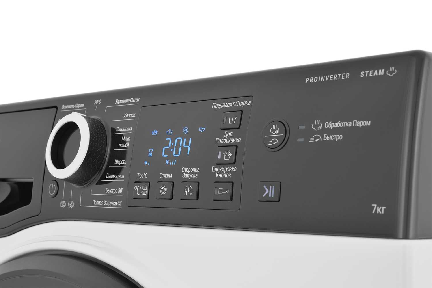 - Функция отложенного старта (таймер до 24 часов) позволяет оптимизировать график стирки.