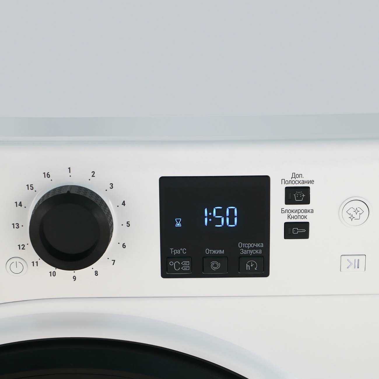 - Световая индикация этапов стирки (набор воды, нагрев, полоскание) повышает контроль процесса.