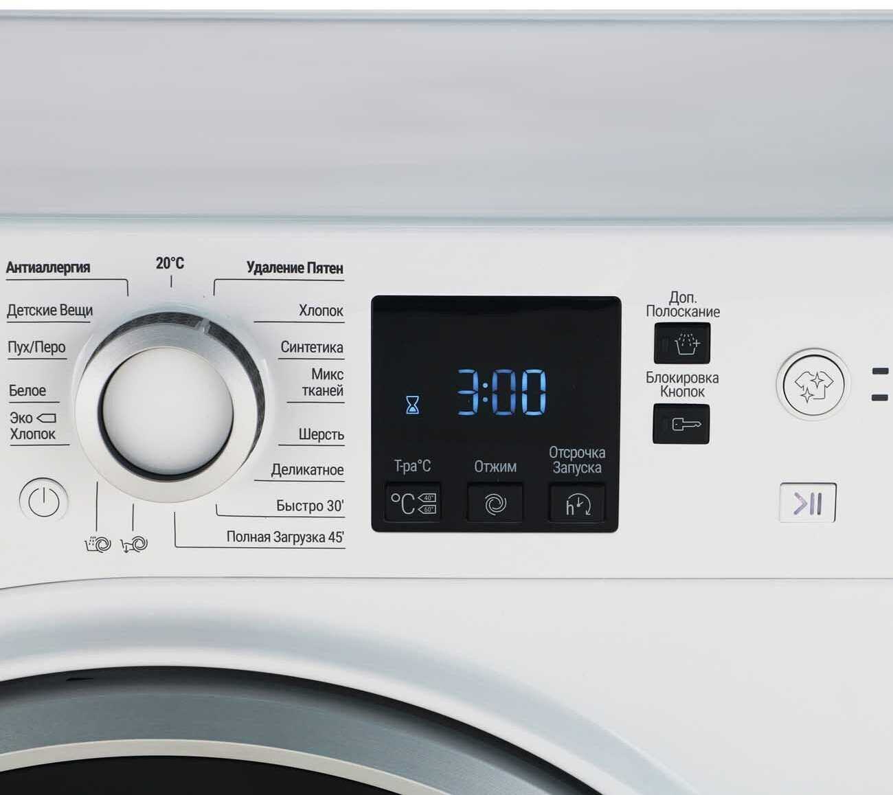 - Звуковые оповещения о блокировке люка и завершении стирки.