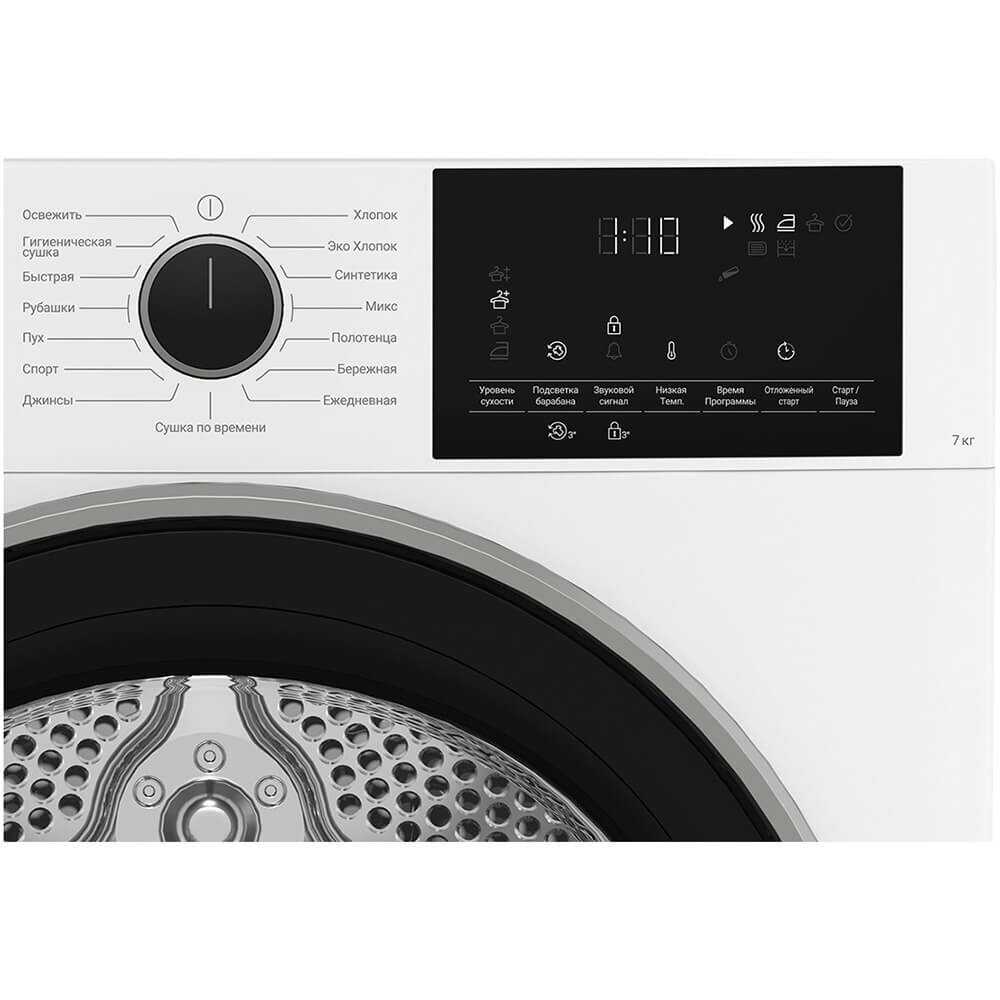 - Много режимов с выбором остаточной влажности (под утюг, в шкаф, гигиеническая с паром), индикацией времени и подсветкой барабана для контроля.