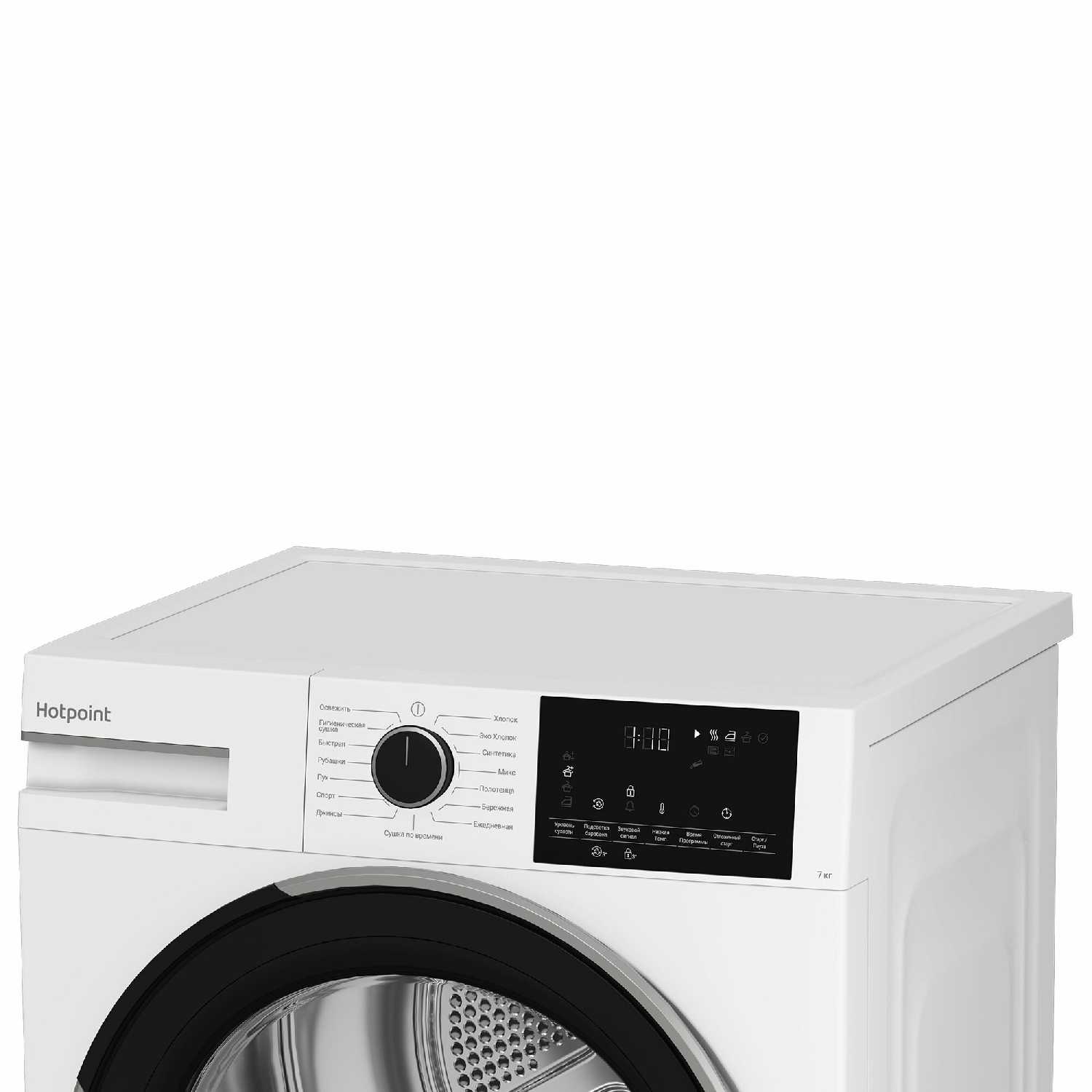 - Много режимов с выбором остаточной влажности (под утюг, в шкаф, гигиеническая с паром), индикацией времени и подсветкой барабана для контроля.