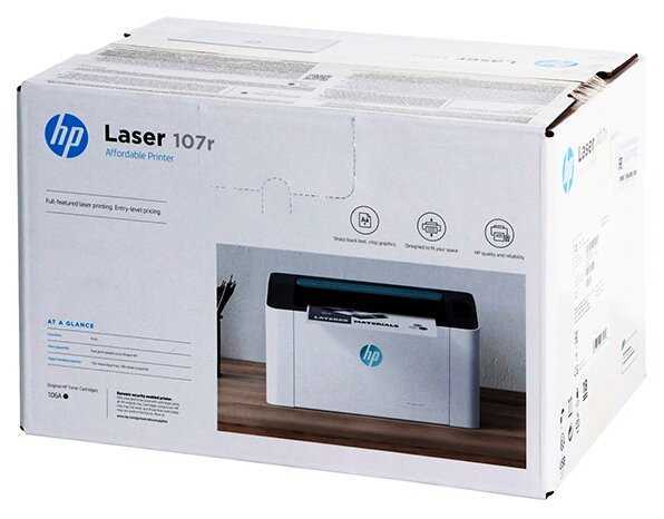 Комплектация : | Принтер HP Laser 107r, предустановленный лазерный картридж HP Laser 106a черный (500 страниц), руководство по установке, справочное руководство, листовка с информацией о соответствии нормативным требованиям, кабель питания |
