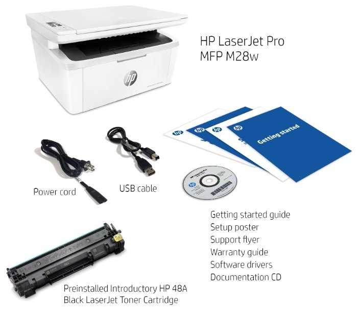 Комплектация : | принтер HP LaserJet Pro M28w, предустановленный стартовый оригинальный лазерный картридж HP LaserJet, черный (500 страниц), руководство по началу работы, плакат с инструкциями по настройке, листовка с информацией о технической поддержке, листовка с декларацией ЕС (только для ЕС), руководство по гарантии, компакт-диск с драйверами и документацией, кабель питания, кабель USB |