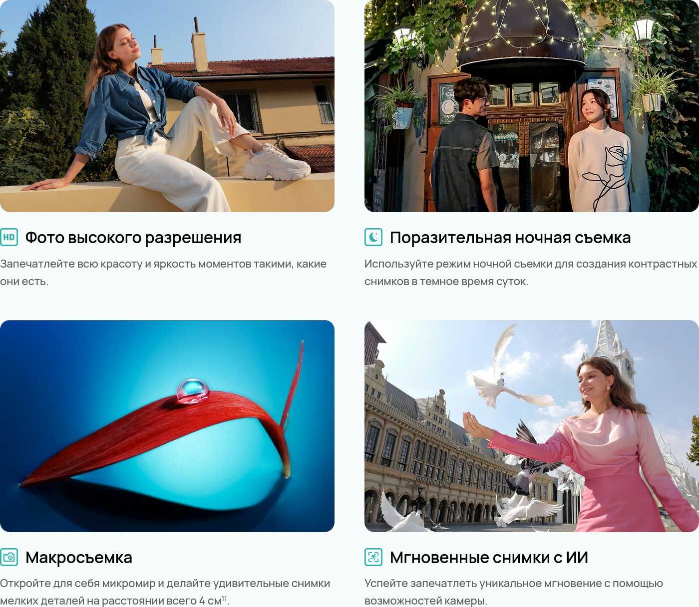 - Ночной режим использует многокадровый алгоритм — выдержка до 4 секунд с ручной фиксацией.