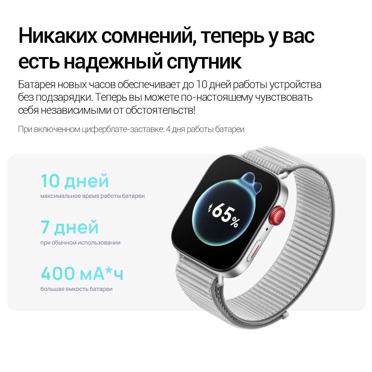 - До 7–10 дней работы при активном использовании (включены уведомления, тренировки, мониторинг сна).