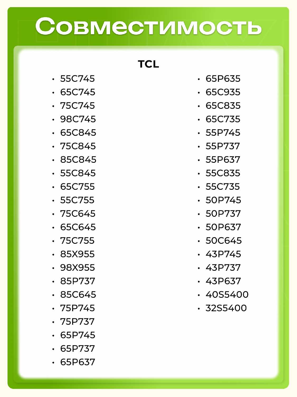 Совместимые модели : | Artel UA32H1200, Artel UA43H1400, Artel UA43H3401, Artel UA43H3502, Artel UA50H3401, Artel UA50H3502, BBK 24LEX-7389/TS2C, BBK 24LEX-7390/TS2C, BBK 32LEX-7387/TS2C, BBK 32LEX-7388/TS2C, BBK 32LEX-7389/TS2C, BBK 39LEX-7389/TS2C, BBK 43LEX-7387/FTS2C, BBK 43LEX-7389/FTS2C, BBK 43LEX-8361/UTS2C, BBK 43LEX-8387/UTS2C, BBK 43LEX-8389/UTS2C, BBK 55LEX-8327/UTS2C, BBK 55LEX-8361/UTS2C, DEXP H32G8100Q, DEXP U43G8200Q, HYUNDAI H-LED32FS5004, HYUNDAI H-LED32FS5006, HYUNDAI H-LED43FS5004, HYUNDAI H-LED43FU7004, HYUNDAI H-LED50FU7002, HYUNDAI H-LED50FU7004, HYUNDAI H-LED55FU7004, HYUNDAI H-LED65FU7002, HYUNDAI H-LED75FU7002, Hi VHIX-43U169, Hi VHIX-50U169, Hi VHIX-55U169, Hi VHIX-65U169, Irbis 43F1SBR204BS2, KIVI 32F700, KIVI 32FR50, KIVI 32FR52, KIVI 32H700, KIVI 32H710, KIVI 40F730, KIVI 40FR50, KIVI 40FR52, KIVI 40UR50, KIVI 43U700, KIVI 43U710, KIVI 50U710, KIVI 50U730, KIVI 50UR50, KIVI 55U710KB, KIVI 55U730GR, KIVI 55UR50GR, KIVI 65U700, LG 24LN510S, LG 24LP451V, LG 24TN510S-PZ, LG 24TN520S, LG 28LN515S, LG 28LN515S-PZ, LG 28TN515S, LG 28TN525S, LG 32LM570BPLA, LG 32LM6300PLA, LG 32LM630BPLA, LG 32LM6390PLC, LG 43LM5700, LG 43LM6300PLA, LG 43UM7020PLF, LG 43UM7090, LG 43UN68006LA, LG 43UN70006LA, LG 49UM7020, LG 49UM7090, LG 50UN68006, LG 55UN68006LA, LG 55UN70006LA, LG 70UN70706, LG 75UM7020, LG 75UM7090, LG 75UN70706, LG OLED88ZX9lA, Novex NWX-50U169TSS, Novex NWX-55U169TSS, Novex NWX-65U169TSS, Prestigio PTV40SS07Y, Prestigio PTV43SS07X, Prestigio PTV43SS07Y, Prestigio PTV50SS07X, Prestigio PTV65SS07X, SBER SBX-43U219TSS, SBER SBX-50U219TSS, SBER SBX-55U219TSS, SBER SBX-65U219TSS, STARWIND SW-LED32SB303, STARWIND SW-LED40SB303, STARWIND SW-LED43UB403, STARWIND SW-LED50UB403, STARWIND SW-LED55UB403, STARWIND SW-LED58UB405, STARWIND SW-LED65UB405, SunWind SUN-LED24B10, SunWind SUN-LED24S10, SunWind SUN-LED32S12, SunWind SUN-LED43S12, SunWind SUN-LED43U11, SunWind SUN-LED50U11, SunWind SUN-LED55U11, SunWind SUN-LED65U12, TCL 43P637, TCL 43P737, TCL 43P745, TCL 50P637, TCL 50P737, TCL 50P745, TCL 55C735, TCL 55C835, TCL 55P637, TCL 55P737, TCL 55P745, TCL 65C645, TCL 65C735, TCL 65C835, TCL 65C935, TCL 65P635, TCL 65P637, TCL 65P737, TCL 65P745, TCL 75P737, TCL 75P745, TCL 85C645, TCL 85P737, Thomson T43FSL5131, Toshiba 32ML963RB, Toshiba 32TL933RB, Toshiba 42VL963RB, Toshiba 46TL933RB, Vekta LD-24SR4815BS, iFFALCON IFF43U62, iFFALCON IFF50U62, iFFALCON IFF55U62, iFFALCON IFF65U62, Витязь 50LU1221, Витязь 55LU1221, Витязь 65LU1221 |