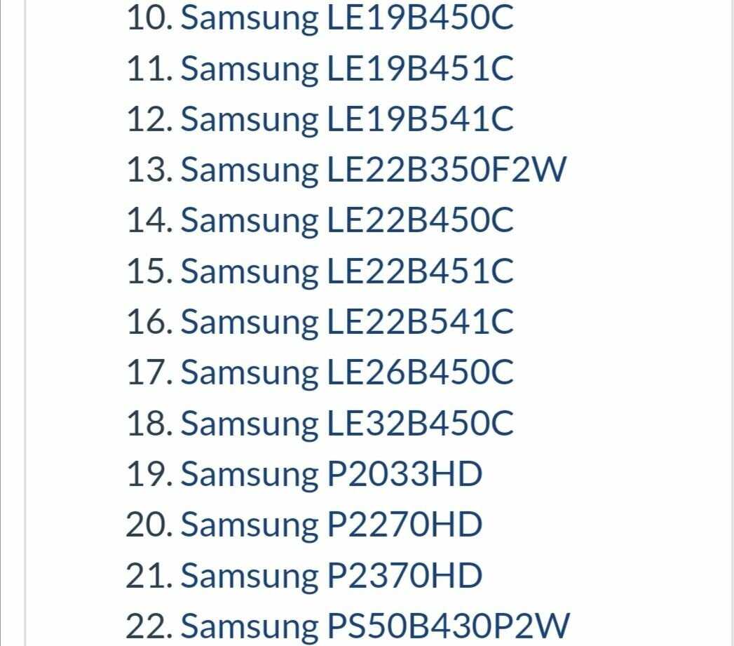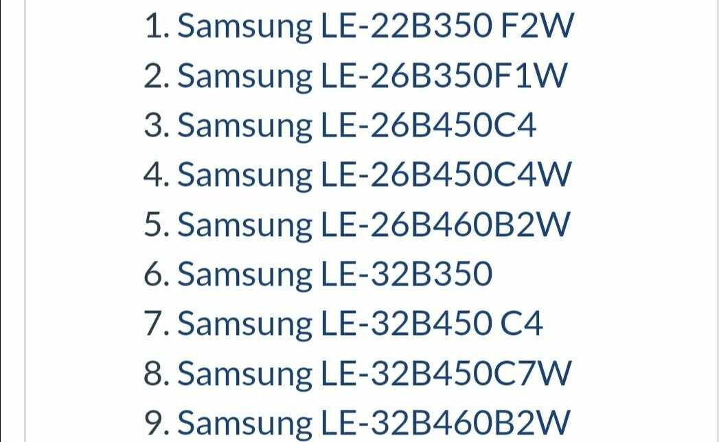 | Назначение : | LE-22B350 F2W, LE-26B350F1W, LE-26B450C4, LE-26B450C4W, LE-26B460B2W, LE-32B350, LE-32B450 C4, LE-32B450C7W, LE-32B460B2W, LE19B450C, LE19B451C, LE19B541C, LE22B350F2W, LE22B450C, LE22B451C, LE22B541C, LE26B450C, LE32B450C, P2033HD, P2270HD, P2370HD, PS50B430P2W |