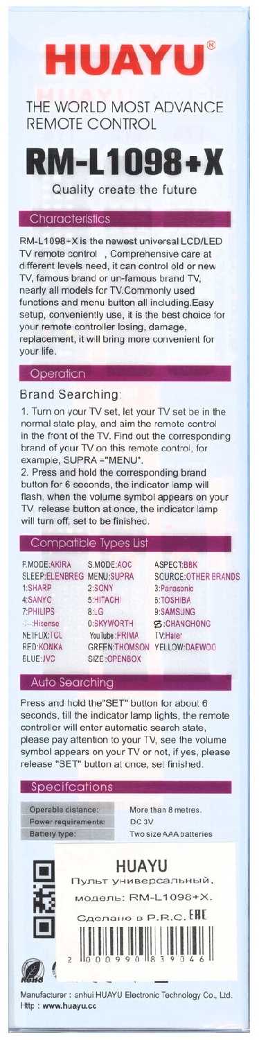 Характеристи Huayu для LCD TV RM-L1098+X универсальные