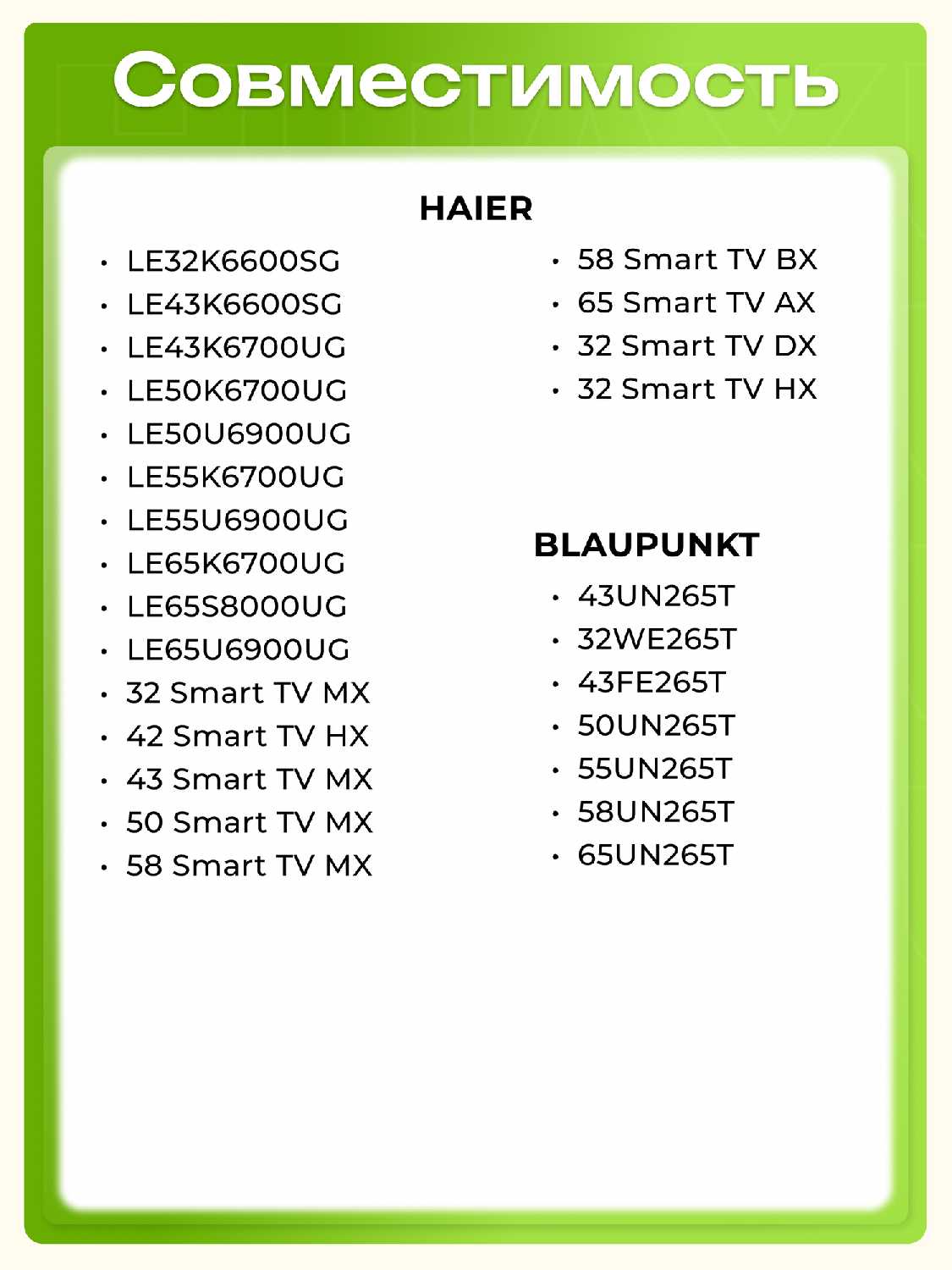 Совместимые модели : | Haier 32 Smart TV BX, Haier 32 Smart TV DX, Haier 32 Smart TV MX, Haier 42 SMART TV HX, Haier 43 Smart TV BX, Haier 43 Smart TV MX, Haier 50 SMART TV BX, Haier 50 SMART TV MX, Haier 55 SMART TV BX, Haier 58 Smart TV BX, Haier 65 Smart TV AX, Haier 65 Smart TV BX, Haier LE32K6600SG, Haier LE43K6600SG, Haier LE43K6700UG, Haier LE50K6700UG, Haier LE50U6900UG, Haier LE55K6700UG, Haier LE55Q6500U, Haier LE55U6900UG, Haier LE65K6700UG, Haier LE65S8000UG, Haier LE65U6900UG |