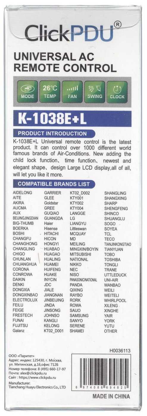Характеристи Huayu K-1038E+L для кондиционера