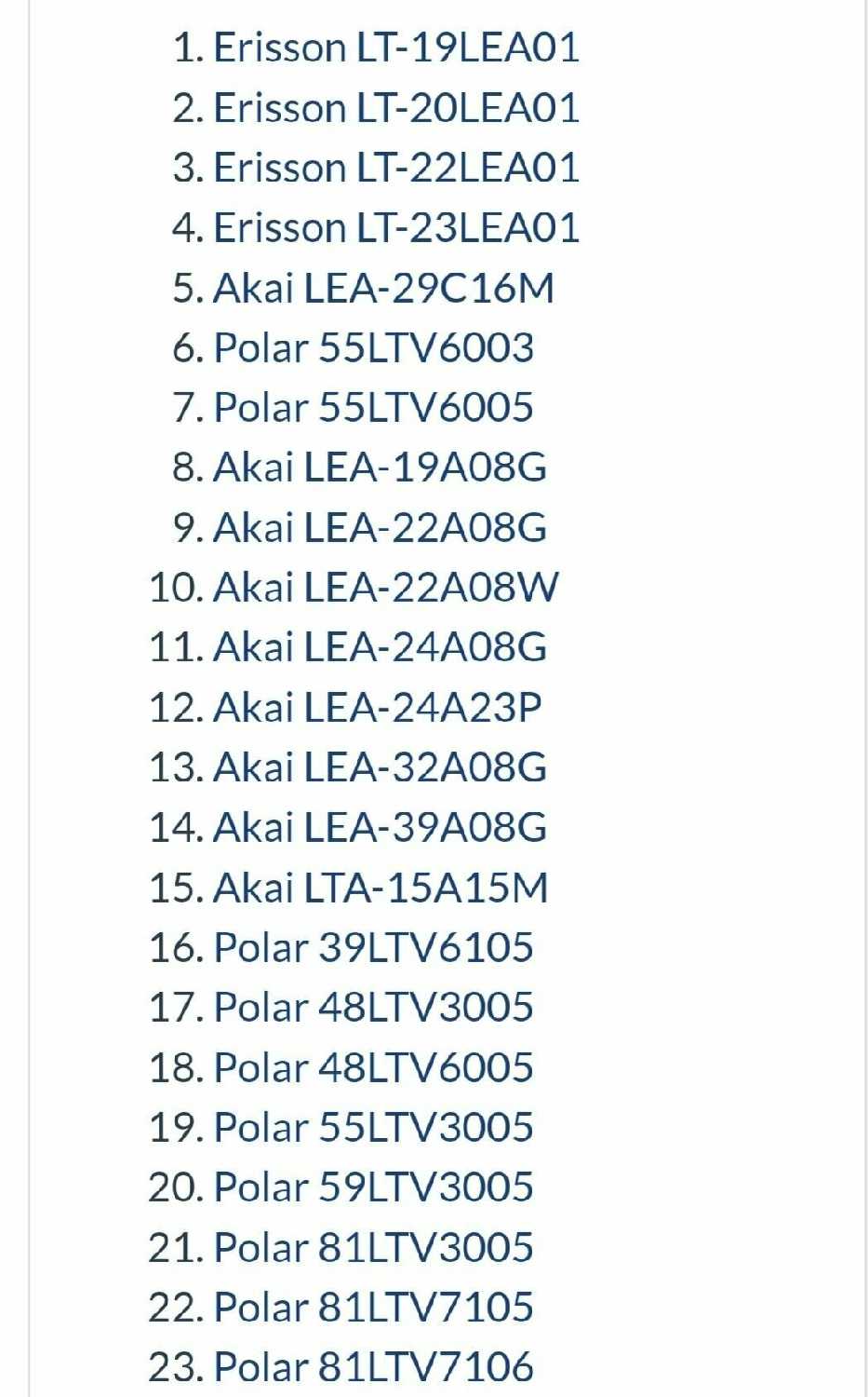 Назначение : | 39LTV6105, 48LTV3005, 48LTV6005, 55LTV3005, 55LTV6003, 55LTV6005, 59LTV3005, 81LTV3005, 81LTV7105, 81LTV7106, LEA-19A08G, LEA-22A08G, LEA-22A08W, LEA-24A08G, LEA-24A23P, LEA-29C16M, LEA-32A08G, LEA-39A08G, LT-19L04, LT-19LEA01, LT-20LEA01, LT-22L06, LT-22L06V, LT-22LEA01, LT-23LEA01, LT-24L02, LT-26L05, LT-32L05, LT-32L05V, LT-32N07, LTA-15A15M, Rolsen RL-19l-1005U, Rolsen RL-22L-1005UF, Rolsen RL-23L-1005UF |