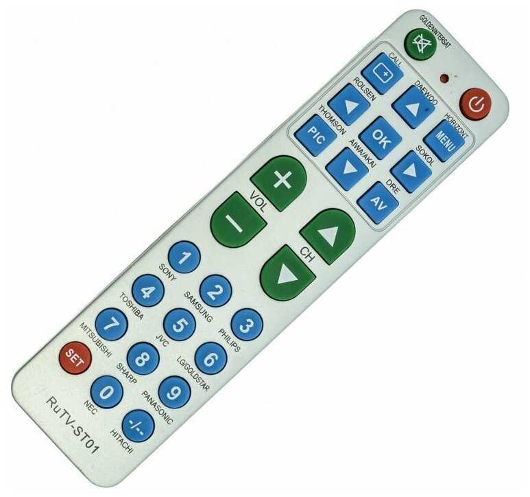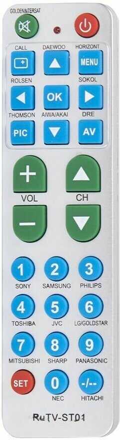 | Производитель совместимых устройств : | Aiwa, Akai, Akira, BBK, BEKO, Daewoo, Elenberg, FUNAI, Hitachi, Horizont, JVC, LG, Panasonic, Philips, Polar, Rolsen, Rubin, Samsung, Sony, TCL, Thomson, Toshiba, Vestel, Витязь |