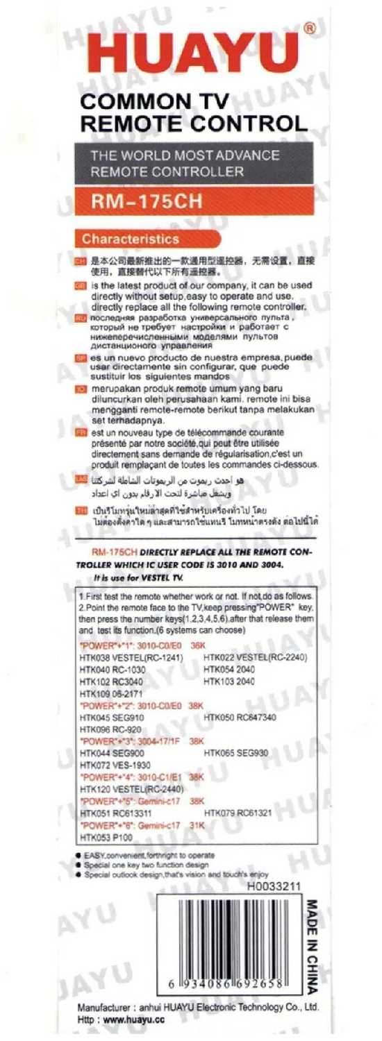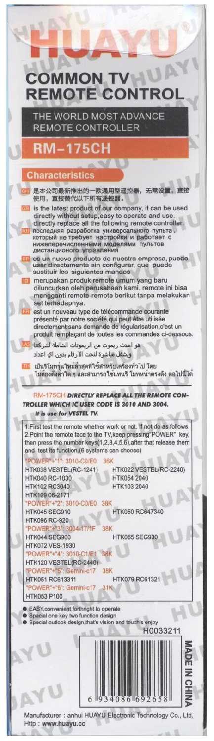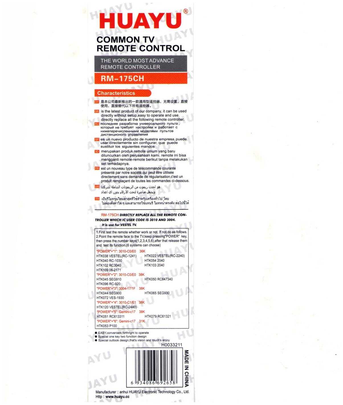 Характеристи Huayu Пульт HUAYU (RM-175CH)