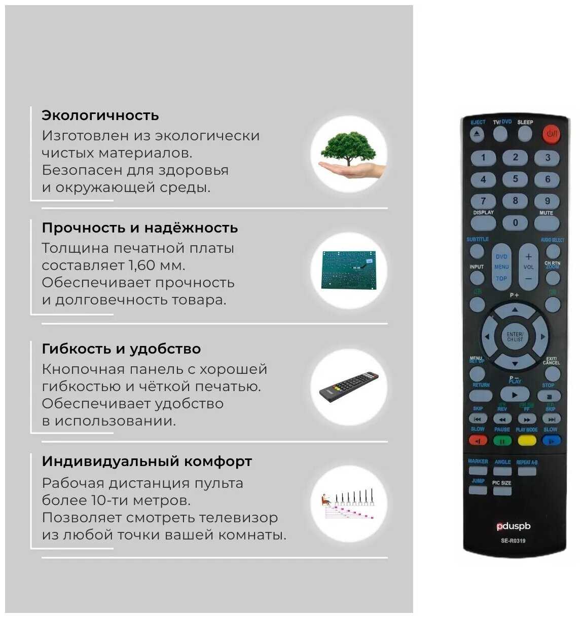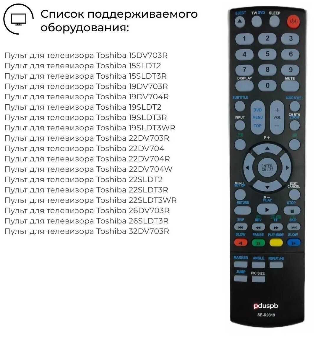 Дополнительная информация : | Внимание! Данный пульт SE-R0319 не универсальный. Он совместим только с телевизорами из списка поддерживаемого оборудования! Подробный список поддерживаемого оборудования смотрите в «Назначении». Для Вашего удобства мы также добавили инструкции по подборке пультов. Пожалуйста, ознакомьтесь с ними перед покупкой. Можете задавать вопросы, мы незамедлительно поможем подобрать пульт для Вашего ТВ. |
