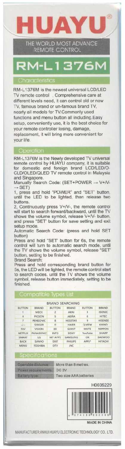 Характеристи Huayu Универсальный пульт RM-L1376M для телевизоров различных марок