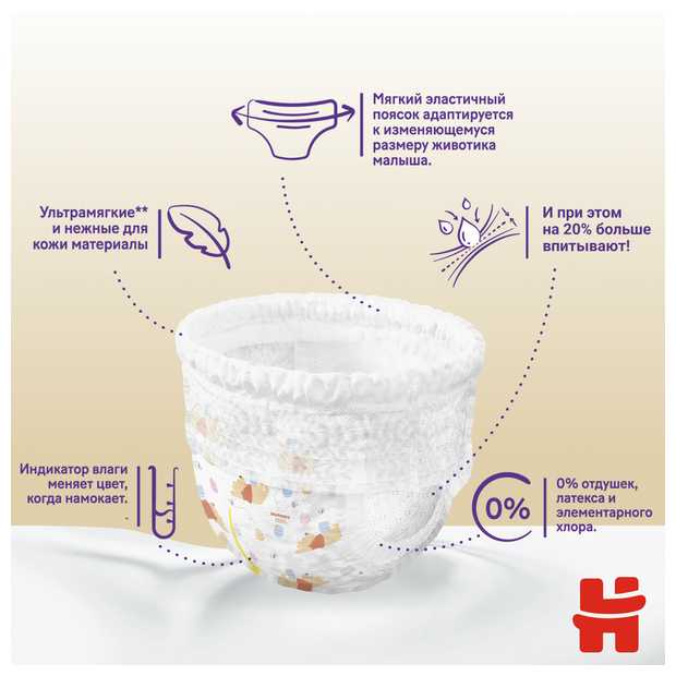 - Формат трусиков позволяет легко надевать и снимать в любой позе, даже на убегающем ребенке, удобнее обычных подгузников.