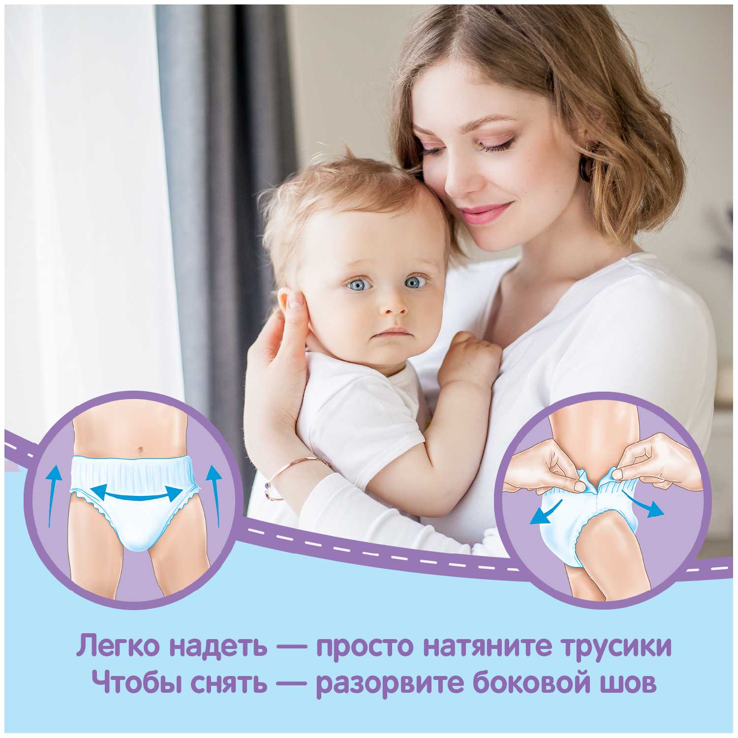- Формат трусиков позволяет легко надевать и снимать без липучек, что упрощает уход за активным малышом.