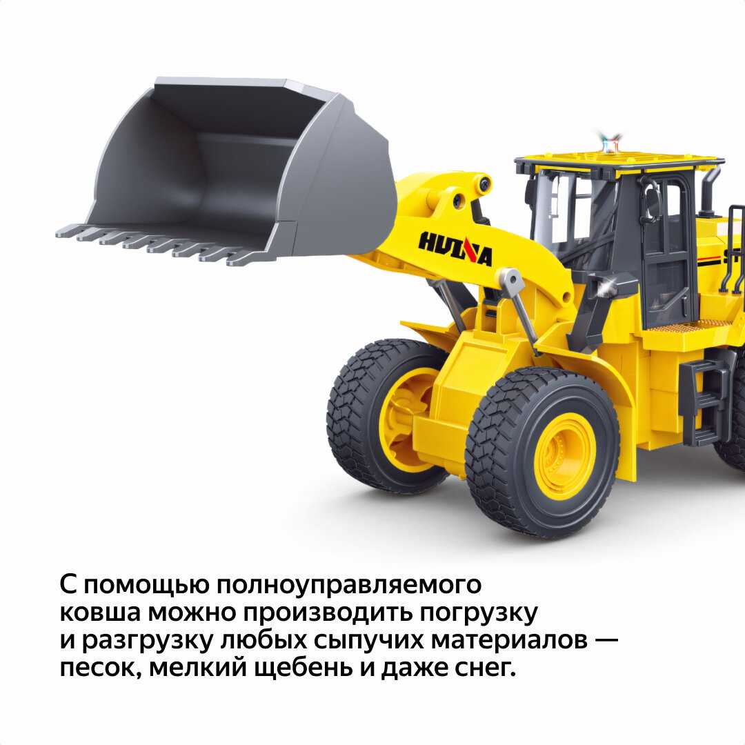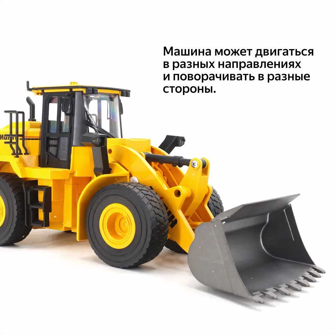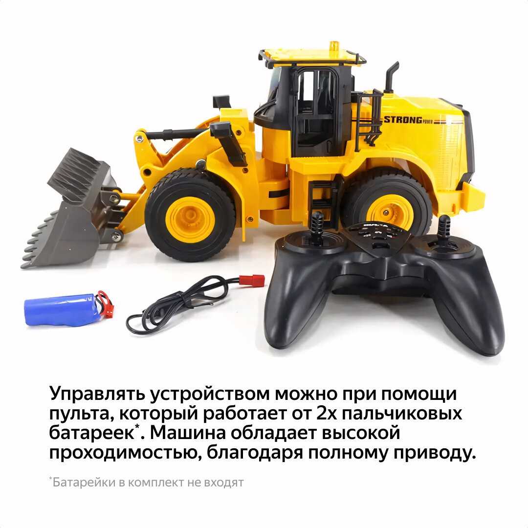 Трактор может двигаться вперёд и назад, поворачивать в обе стороны, поднимать и опускать ковш. Управление осуществляется с помощью удобного пульта с рулём и рычагами.
