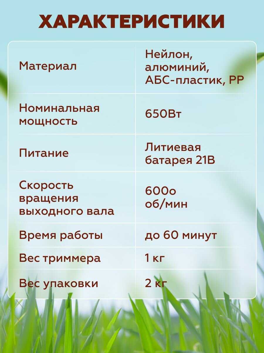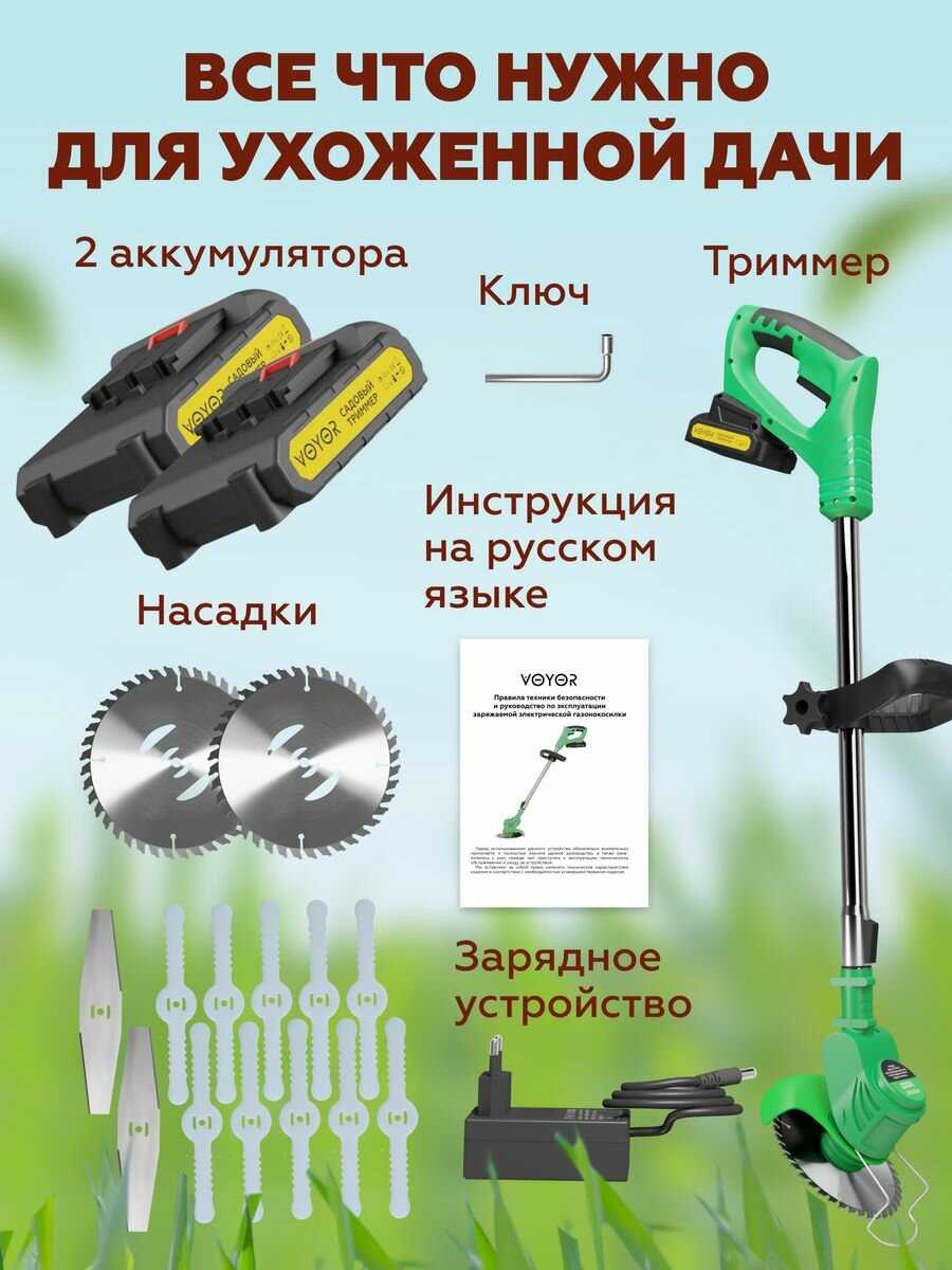 - - батареи садятся быстро очень, две шт на пол часа работы, слабенький для большой и средней травы, газон им косить только, ещё и ключ положили не тот что на картинке, положили рожковый типа велосипедного, с кустарниками диск не справляется, мощность маловата, лучше брать электрический.