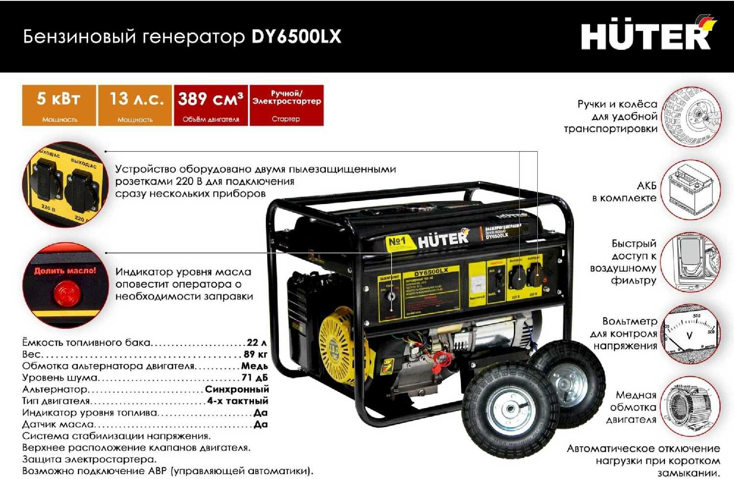 - + Неубиваемый двигатель HUTER. Подключил как резервный источник питания в доме. Работает хорошо.Каркас прочный. Сразу понравилось то, что все записи на передней панели сделаны на русском языке. Там как раз расположены приборы контроля, розетки и датчики. Бензин заливаю 92 марки, бак емкий на 22 литра, хватает надолго. Уровень масла контролируется встроенным датчиком. Запустить двигатель можно как вручную, так и при помощи электрического стартера.