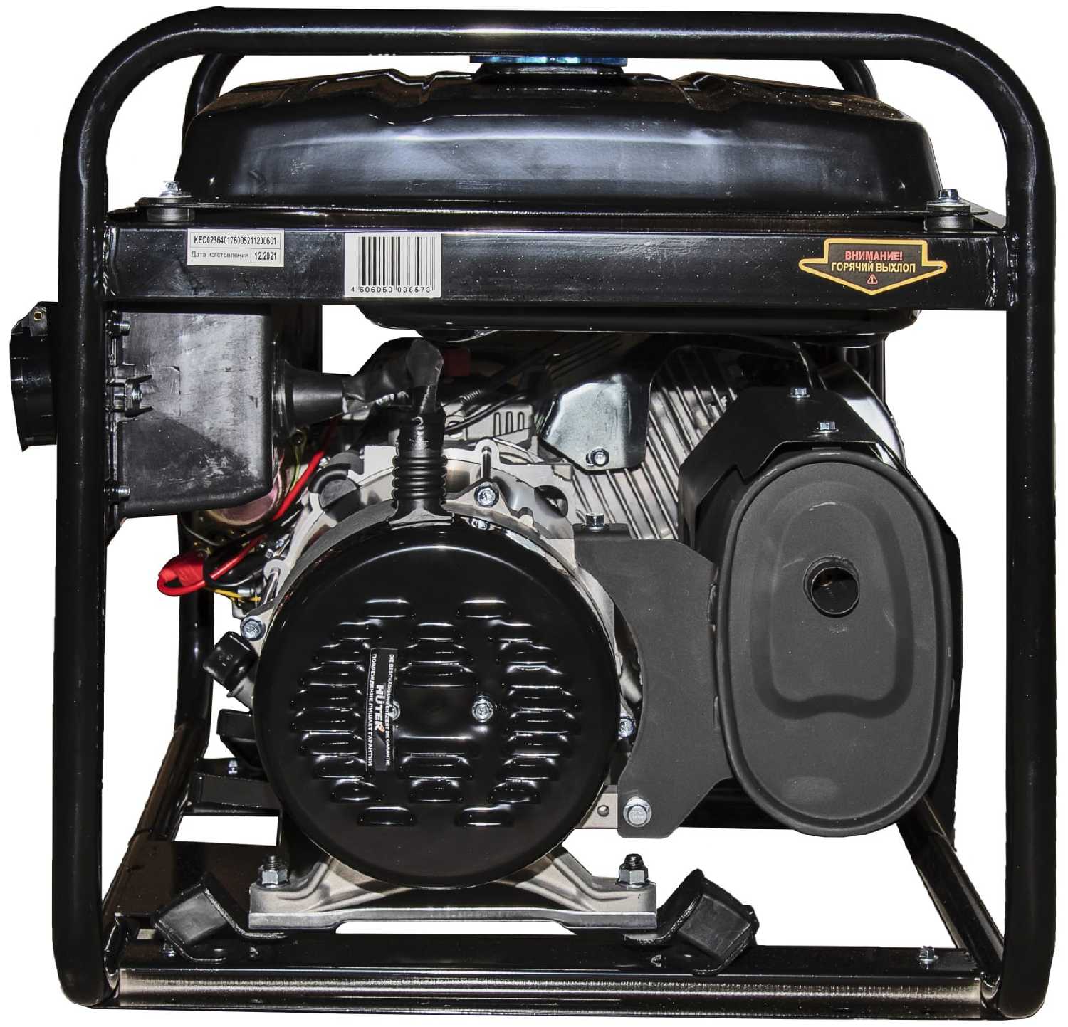 Конструкция открытого типа обеспечивает эффективное охлаждение, но увеличивает уровень шума. Рама выполнена из прочного металла с устойчивостью к коррозии. Серьезный недостаток - отсутствие транспортировочных колес в базовой комплектации. Вес полностью заправленного генератора (около 100 кг) делает его перемещение без дополнительных колес крайне затруднительным - пользователи вынуждены либо монтировать самодельные решения, либо перемещать агрегат вдвоем. Зафиксированы единичные случаи заводского брака: течь топливного крана, отказ вольтметра и критическая поломка клапанного механизма.