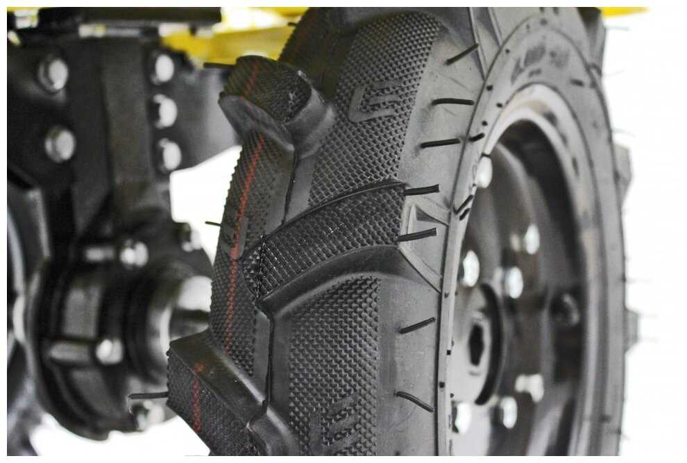Большие пневматические колеса диаметром 45 см с агрессивным протектором обеспечивают отличную проходимость по рыхлой почве и влажному грунту. Однако значительный вес мотоблока (около 79 кг) затрудняет маневрирование на узких участках и переноску. Для улучшения поворотливости некоторые пользователи устанавливают дополнительные ступицы или разблокировку дифференциала. -