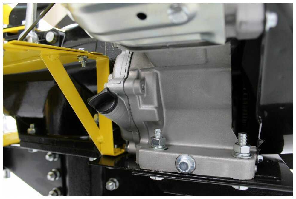 Мотоблок оснащен механической коробкой передач с двумя скоростями вперед и одной задней. Дисковое сцепление обеспечивает надежную передачу крутящего момента, а обратный механизм безопасности останавливает аппарат при отпускании рычага. Важно правильно включать заднюю передачу: сначала перевести рычаг КПП в нейтраль, затем полностью выжать рычаг заднего хода, и только после этого выжимать сцепление — нарушение последовательности приводит к скрежету в редукторе. -