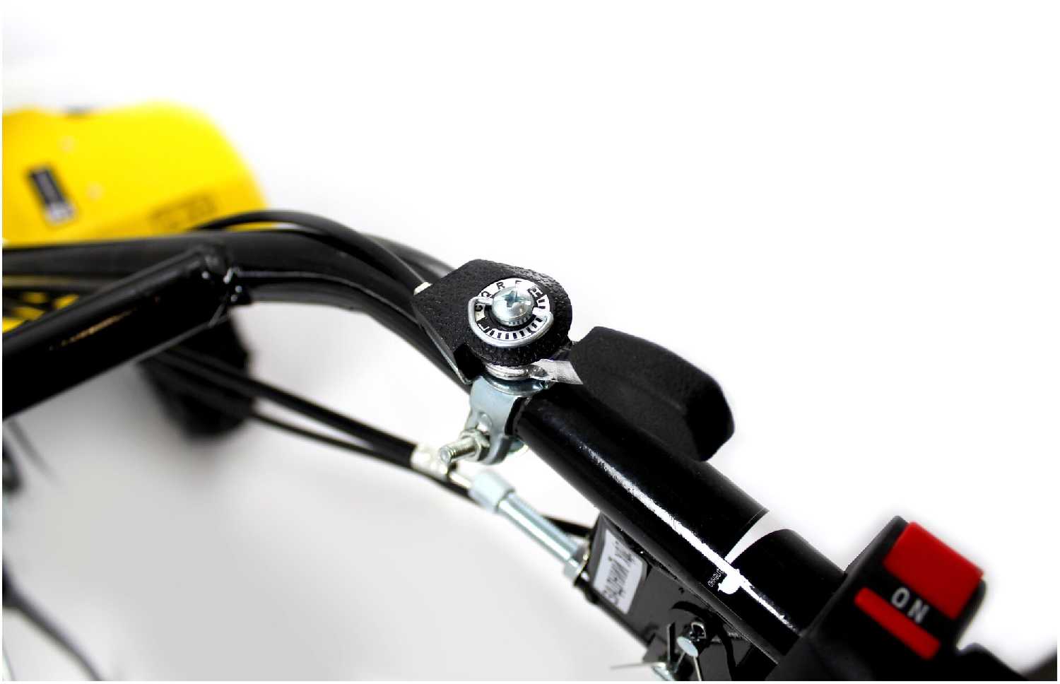 - Руль с прорезиненными ручками и регулировкой высоты снижает вибрацию, позволяя работать без усталости весь день на участках до 1,4 га.
