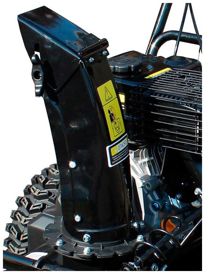 Желоб поворачивается вручную с помощью бокового рычага, но угол ограничен 180°. Дальность выброса зависит от плотности снега: свежий — до 10 м, мокрый — 3-5 м. Некоторые пользователи отмечают залипание снега в желобе при высокой влажности, требующее остановки для очистки. -